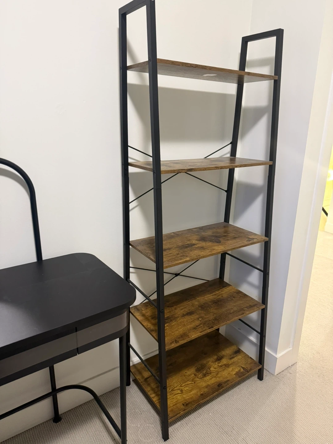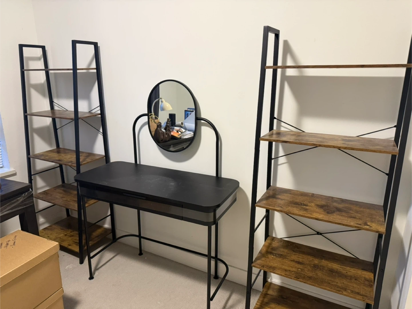 Selling a ladder shelf and vanity table set! The set includes two ladder shelves with a rustic wood finish and a black metal frame. Also included is a black vanity table with a mirror.