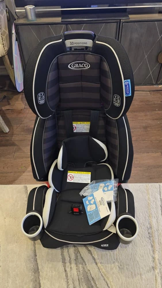 Selling a Graco 4Ever All-in-One car seat! It's in great shape and ready for a new family. This car seat grows with your child, from infant to booster seat, making it a long-lasting and convenient choice. It features a 10-position headrest and a 4-position recline to keep your little one comfy and safe on every journey. Plus, it has two handy cup holders for drinks and snacks