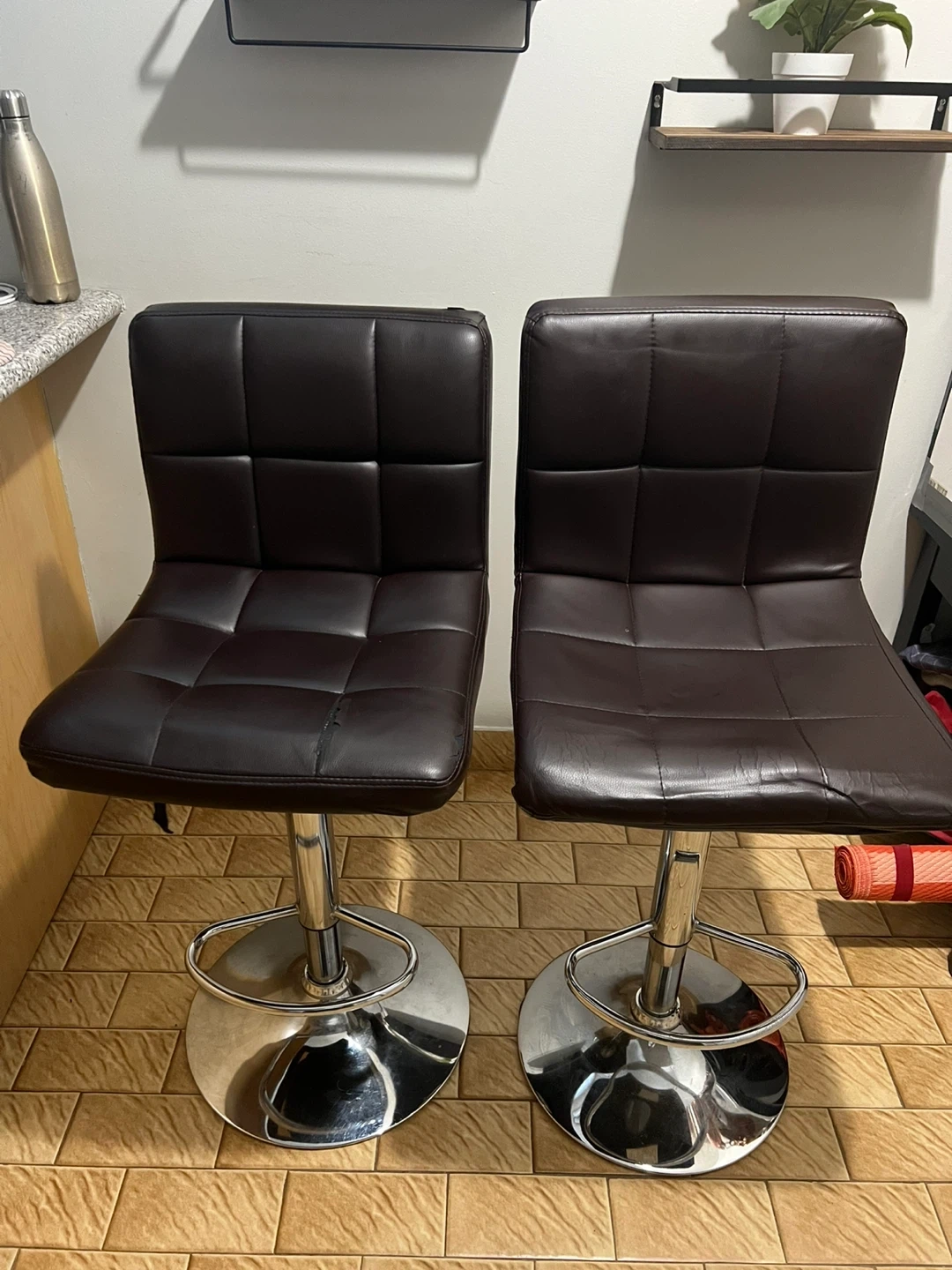 Selling a pair of bar stools with brown faux leather seats! They have a modern look with a chrome base.