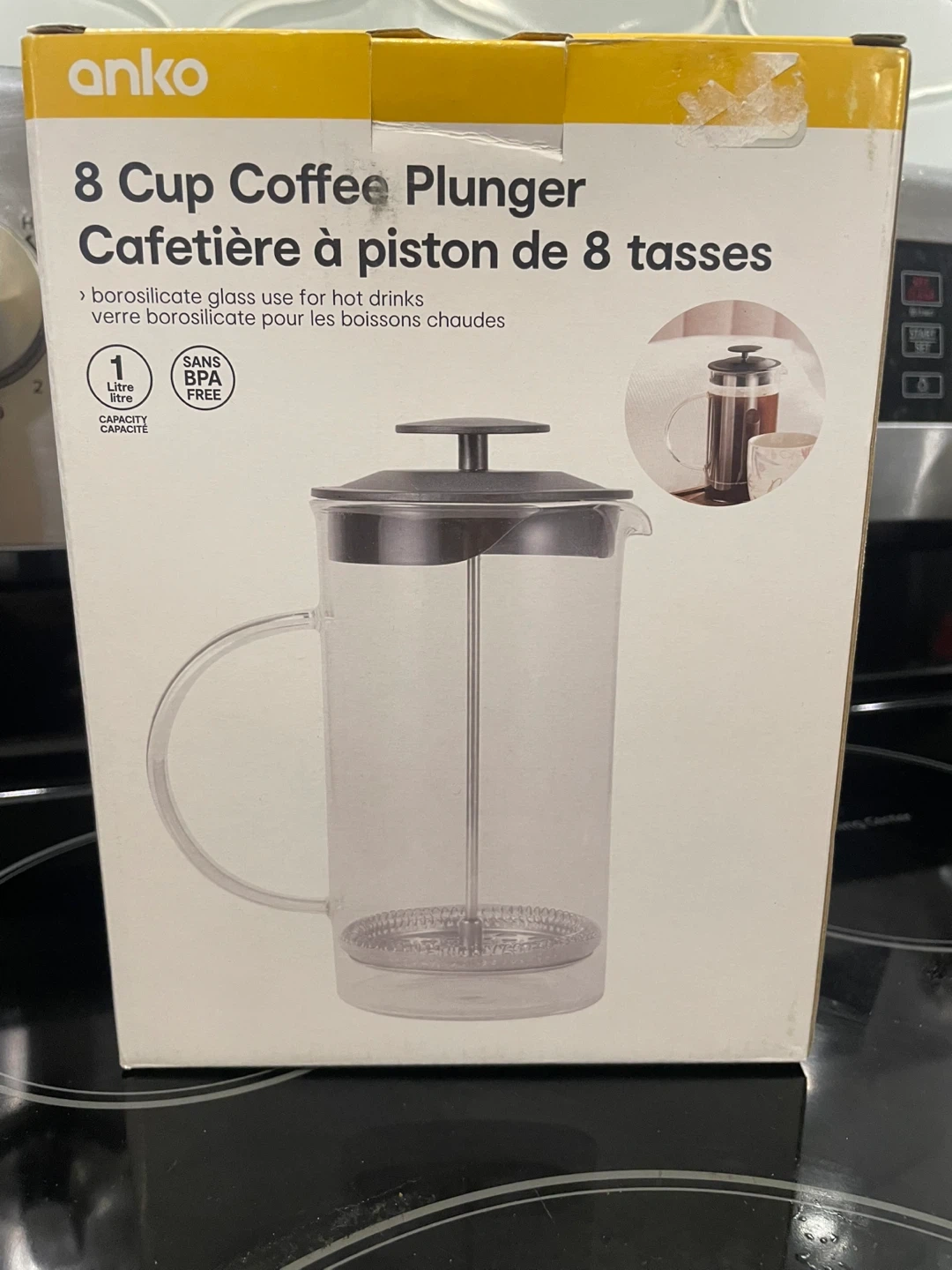 I'm selling an Anko 8 Cup Coffee Plunger! It's made of borosilicate glass, perfect for hot beverages. The capacity is 1 litre. It's BPA free and ready for your next coffee or tea