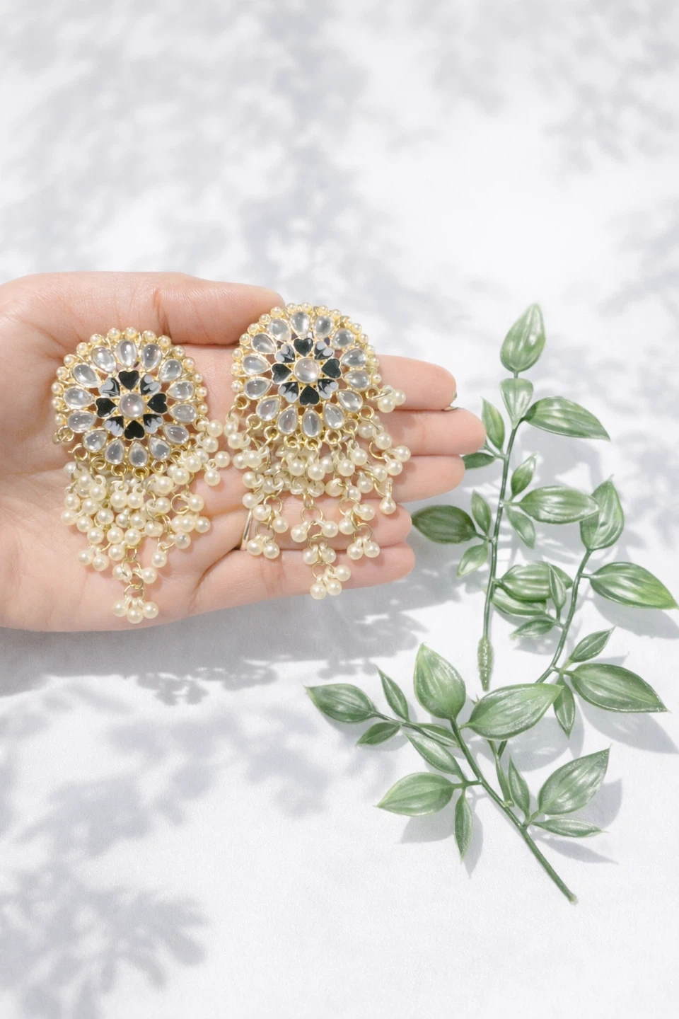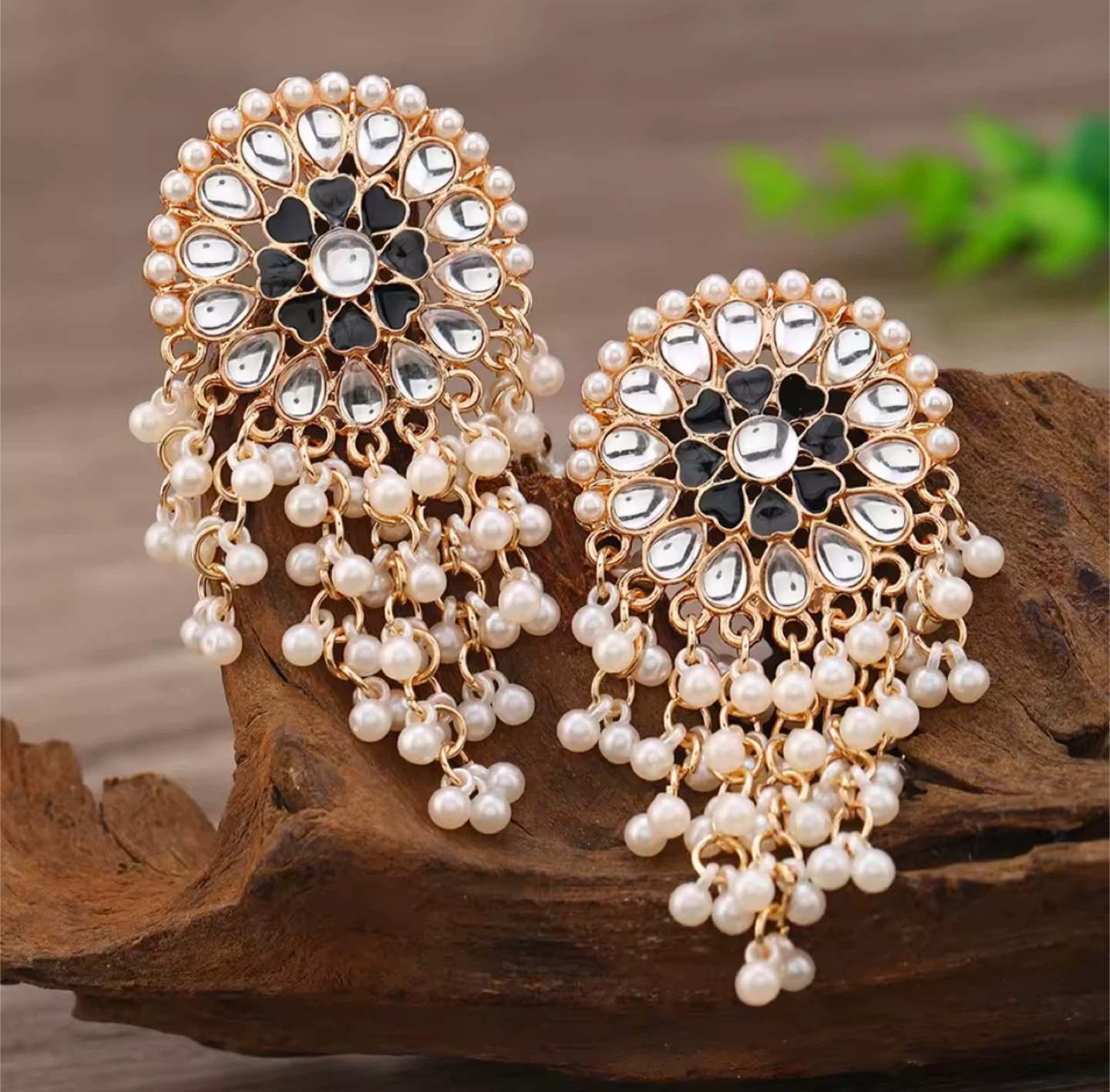 These are a beautiful pair of earrings with pearl drops. They feature a floral design with black and clear accents. Perfect for adding a touch of elegance to any outfit!