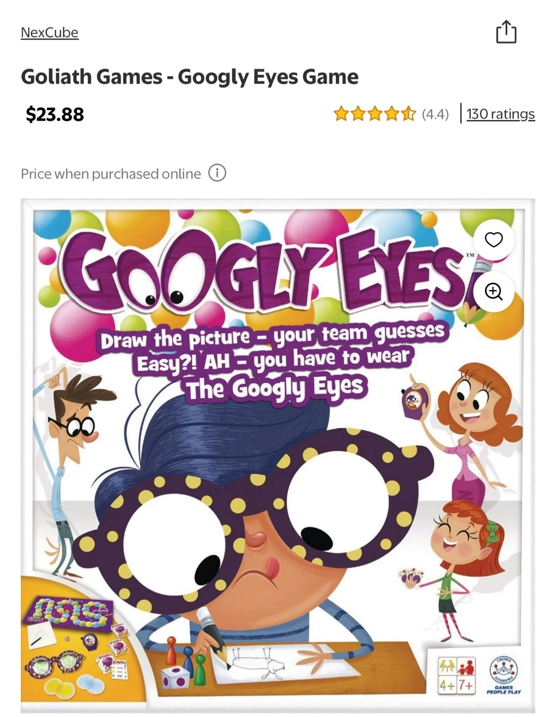 Selling a Googly Eyes game by Goliath Games! It's a fun game where you draw pictures while wearing vision-distorting glasses. Your team has to guess what you're drawing! Suitable for ages 4 and up, and for 2 or more players. Originally bought for $23.88