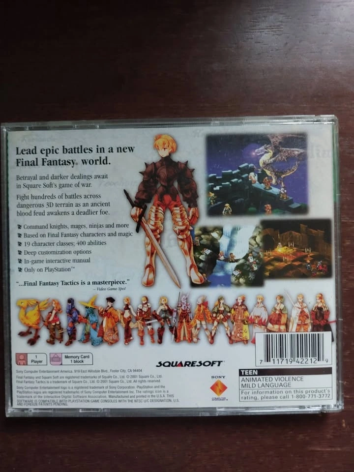 For sale is my copy of Final Fantasy Tactics. I bought this at a con, and haven't really played it much. Don't care much for it now since I don't feel like setting up the original hardware to play it on currently, but it's working perfectly fine still.