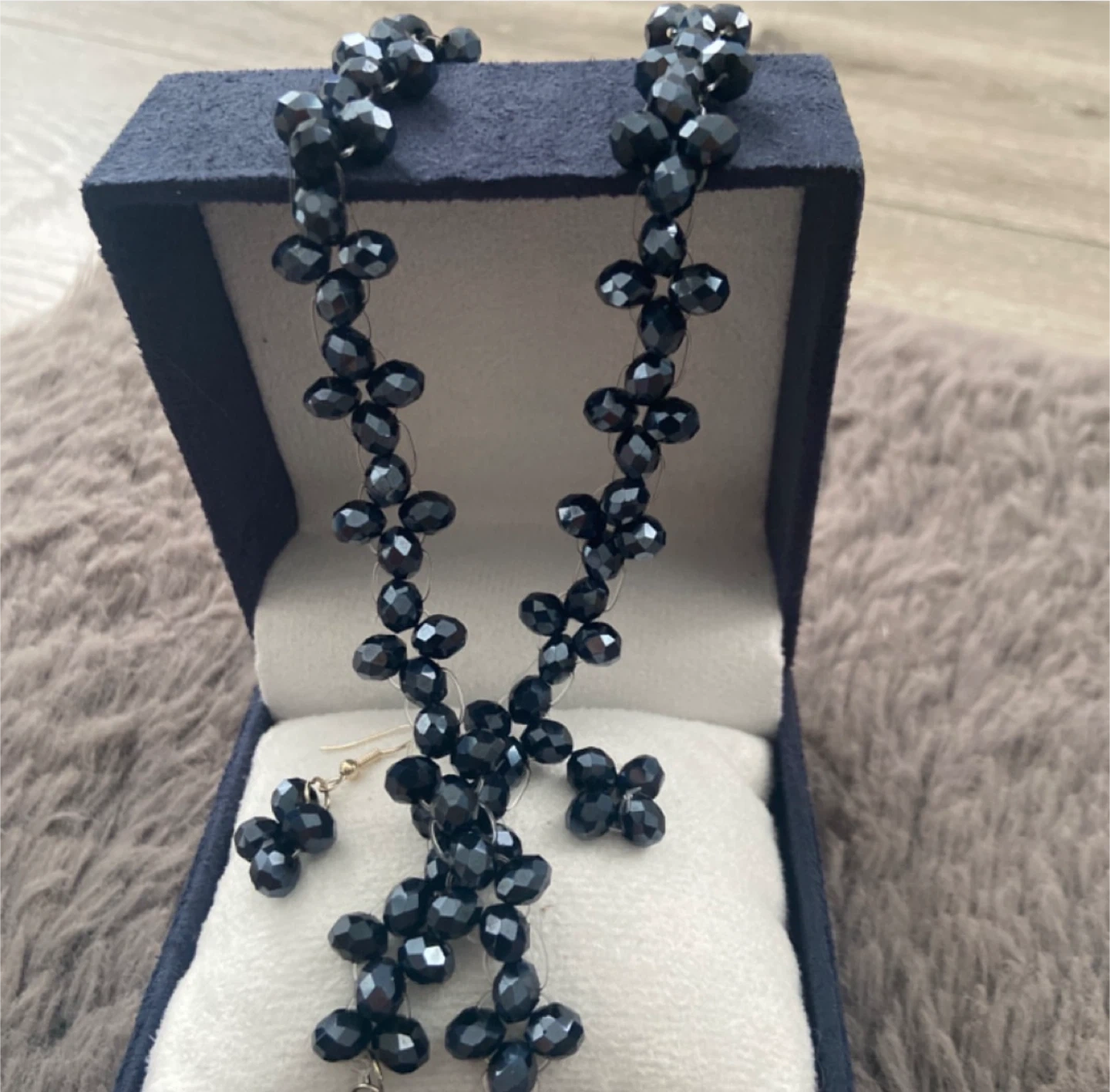 This is a beautiful black beaded necklace and earring set that is in excellent condition! It comes in a box, perfect for gifting or keeping it safe when you aren't wearing it