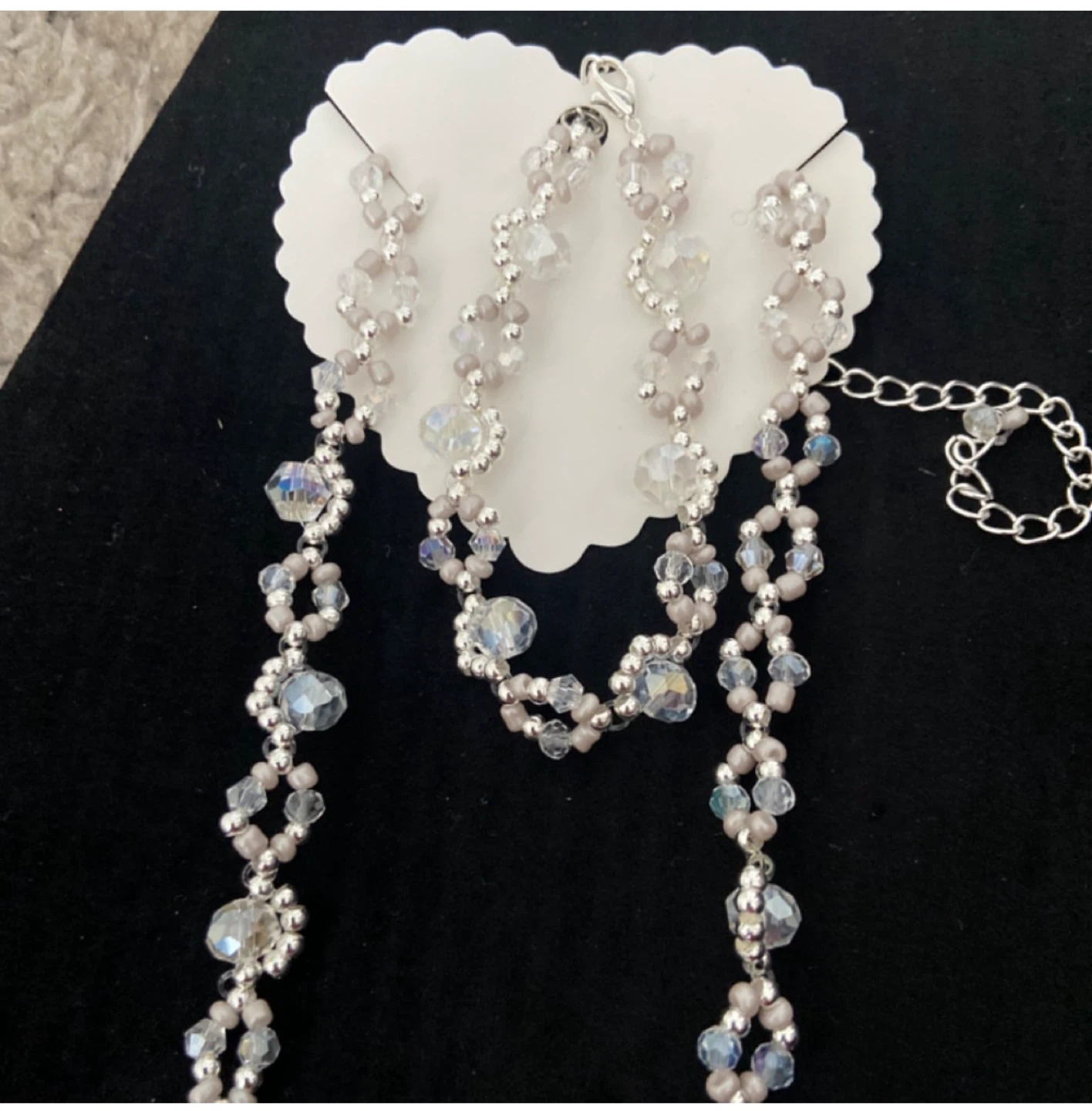 Selling a beautiful handmade beaded jewellery set. It features a delicate necklace and bracelet, perfect for adding a touch of sparkle to any outfit! The beads are a mix of clear and light grey, creating a subtle and elegant look. The set is in great condition and ready to be worn