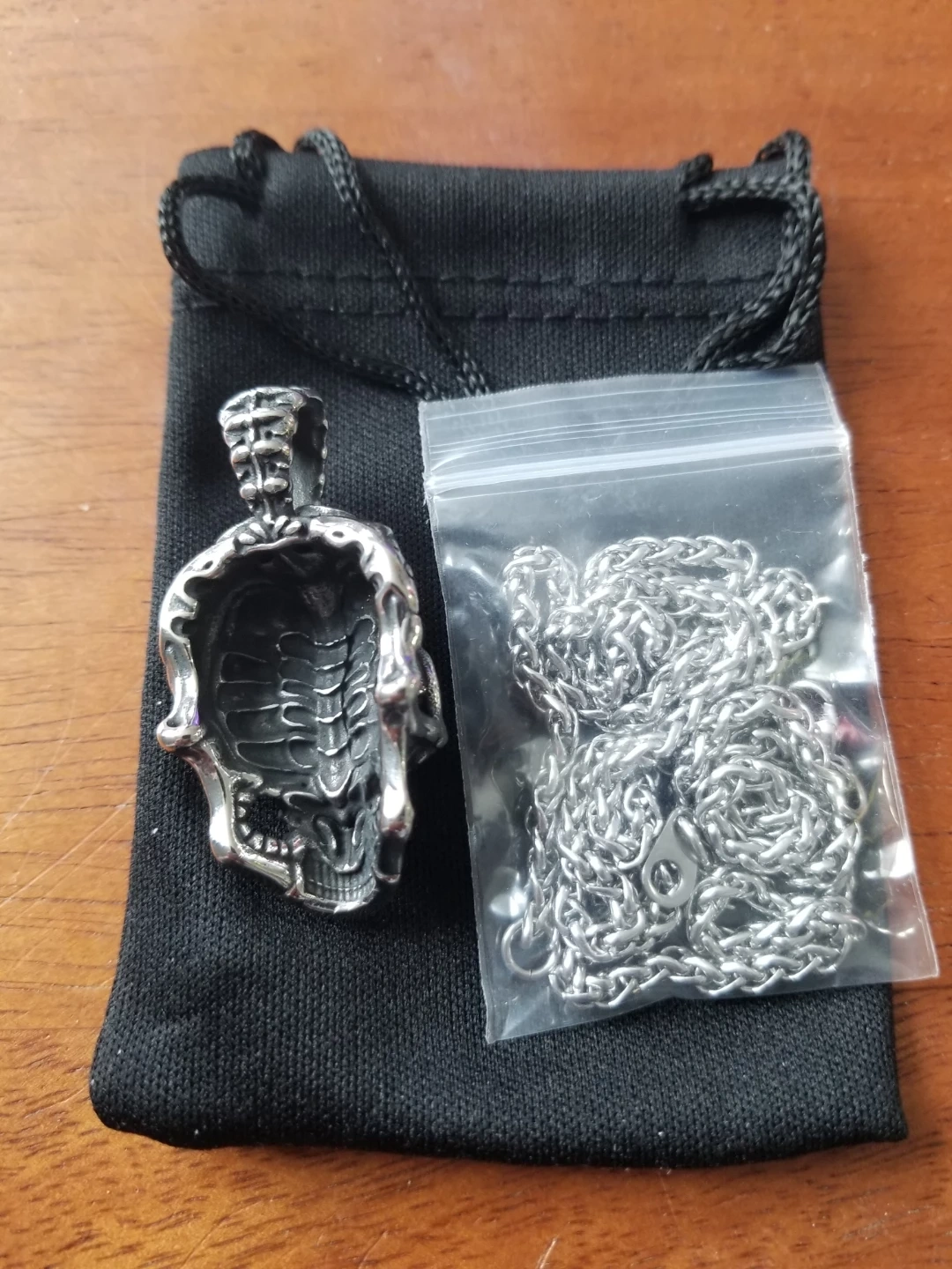Here's a cool skull pendant necklace! It comes with a chain and a small black pouch. The pendant has a detailed skull design, and the chain is a classic style to match. Brand new