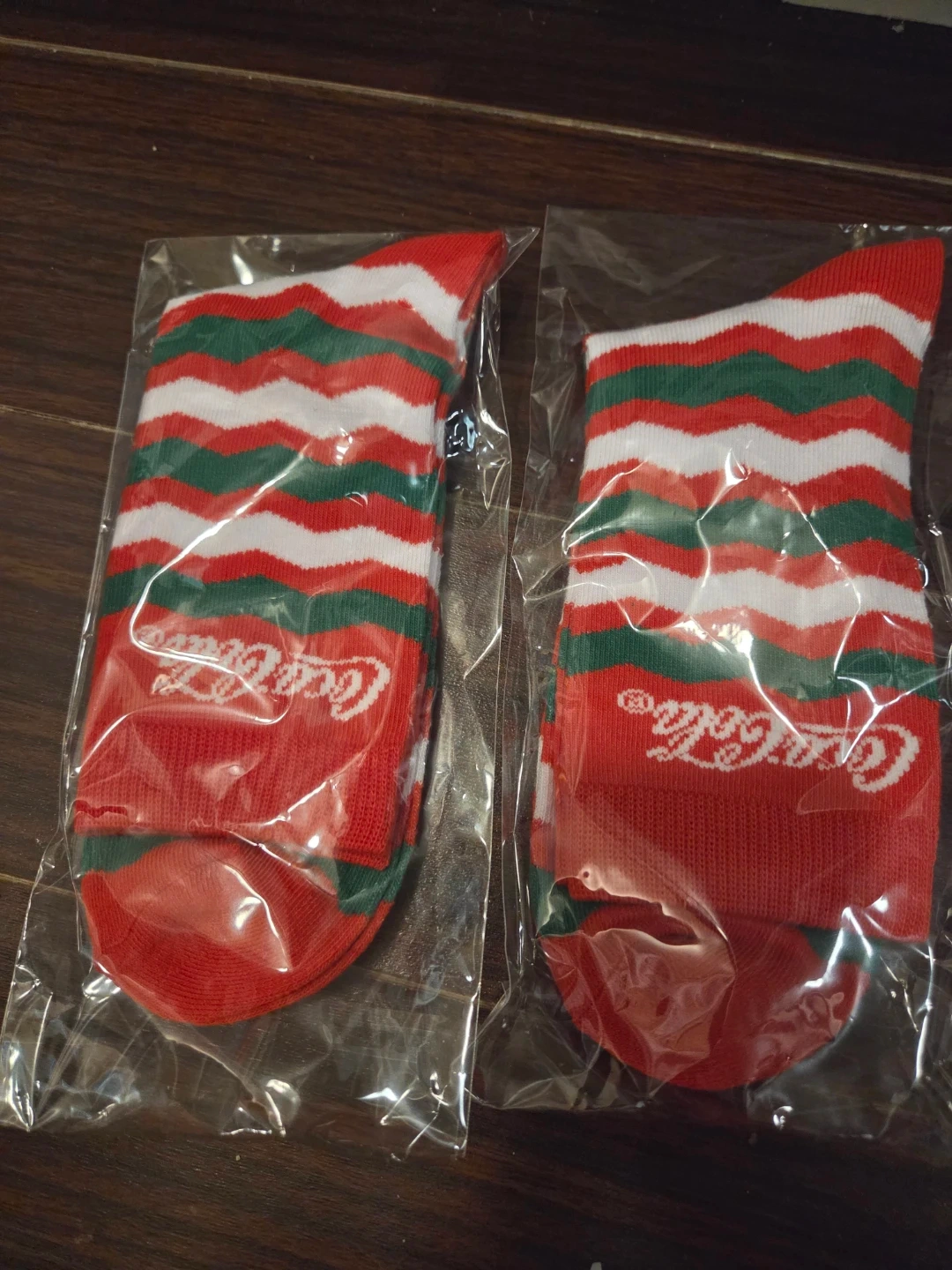 I have a pair of Coca-Cola socks still sealed in their original packaging! They feature a red, white, and green zig-zag pattern. Perfect for adding a bit of fun to your wardrobe or as a gift for a Coca-Cola enthusiast
