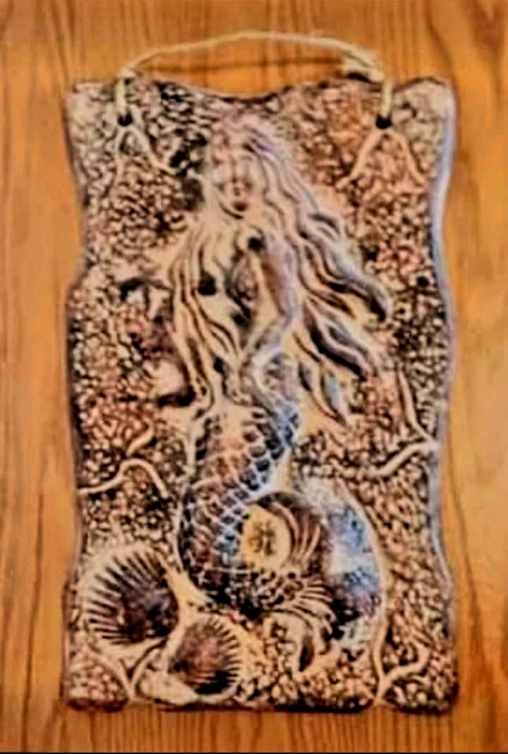 I'm offering a unique antique cast iron plaque featuring a mermaid and sea fossils. This piece has a rustic charm that would complement any collection or serve as a distinctive decorative item.