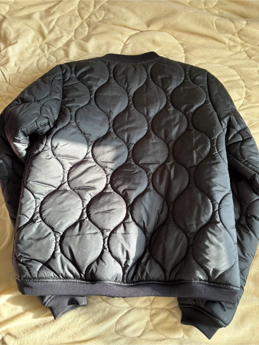 Here's a stylish black quilted bomber jacket from Bench! It's in great condition and perfect for layering.