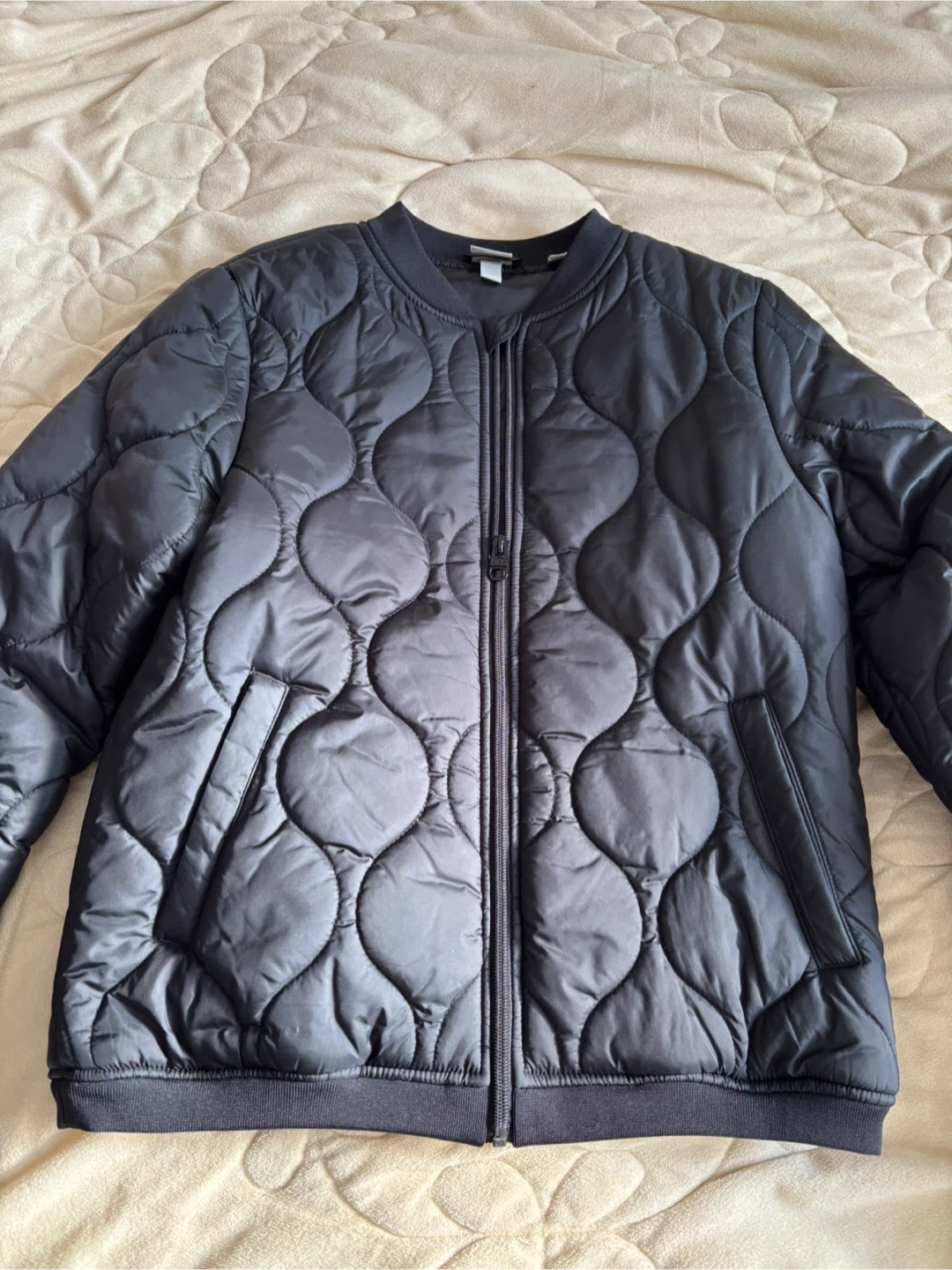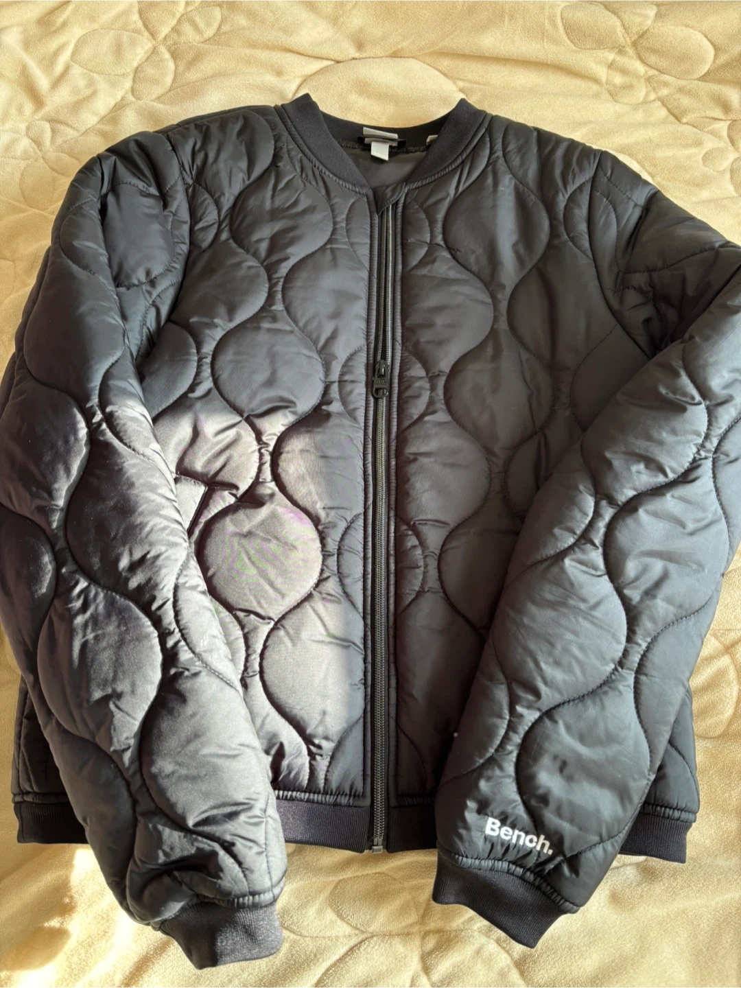 Here's a stylish black quilted bomber jacket from Bench! It's in great condition and perfect for layering.