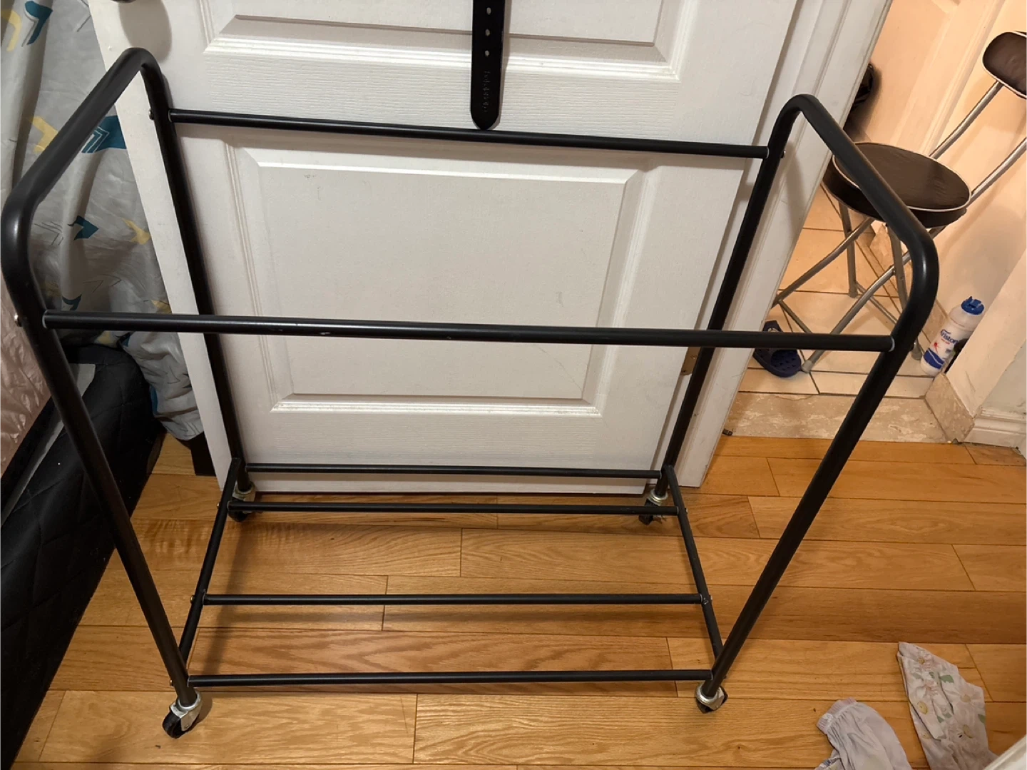 Selling a heavy-duty rolling garment rack with wheels. It's black metal and in great condition. Originally bought for $99. Perfect for organizing your clothes!