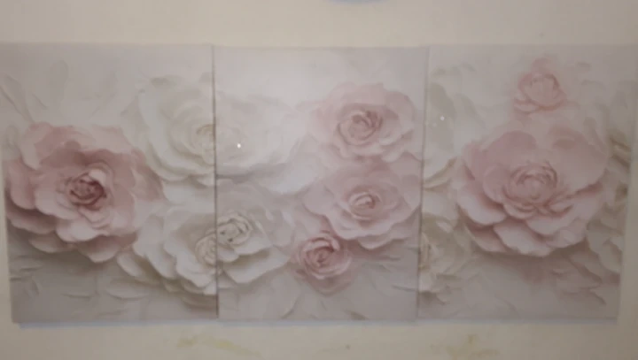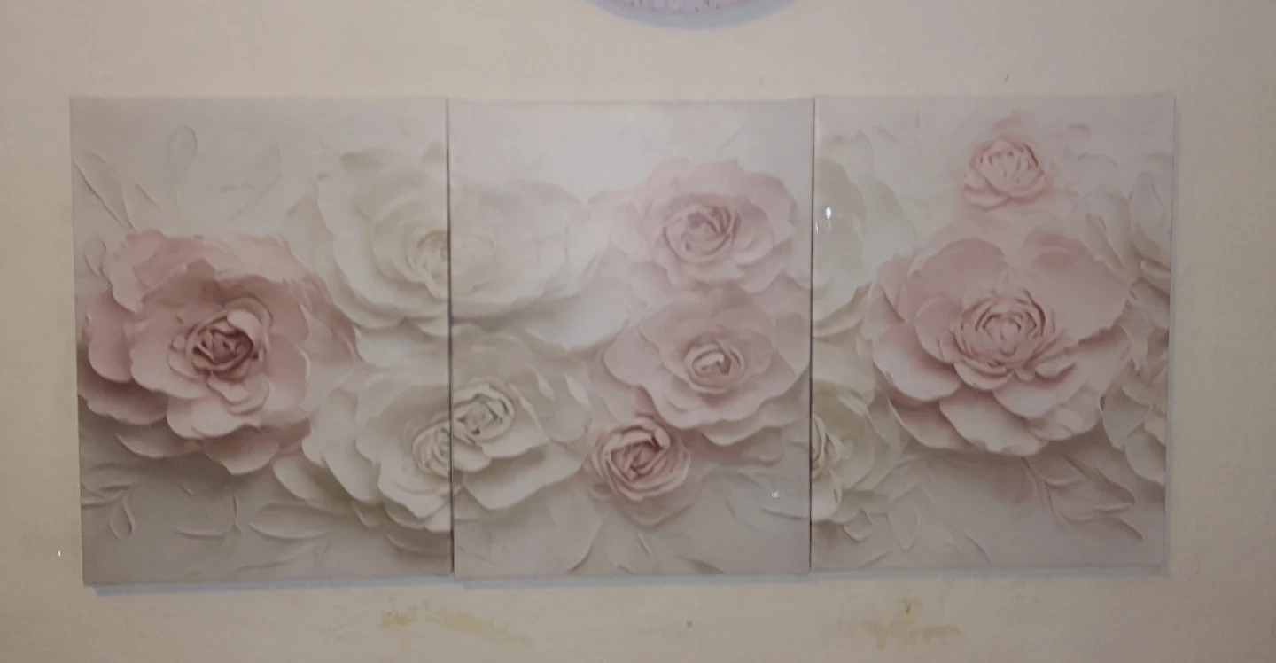 3 rose flowers print (white and pink roses ) on pinkish grey background( not framed) 16"X12" inches X3 prints on canvas but not framed. In 3 rolls . Bought the wrong one and brand new. Paid $26