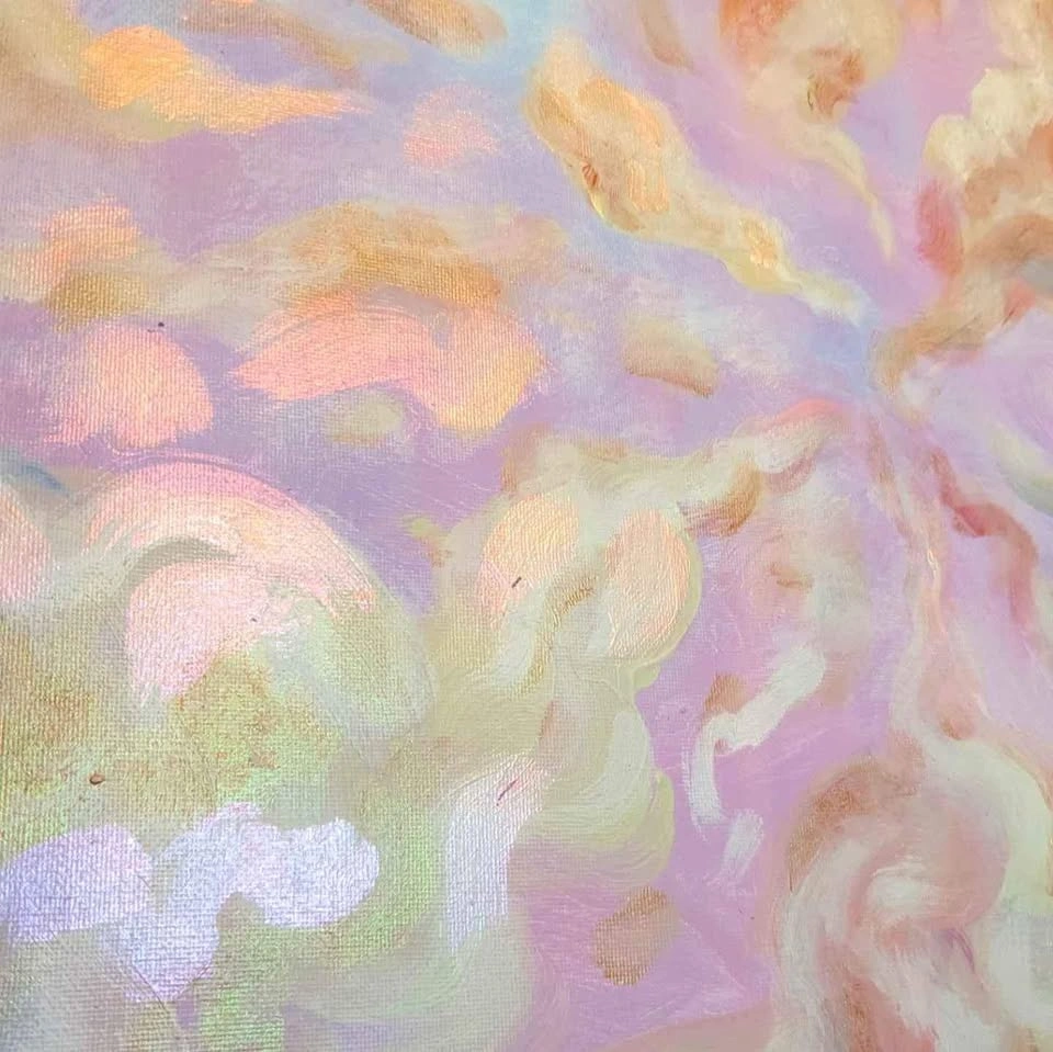 Large iridescent cloud landscape painting, holographic and changes colours as you walk by.