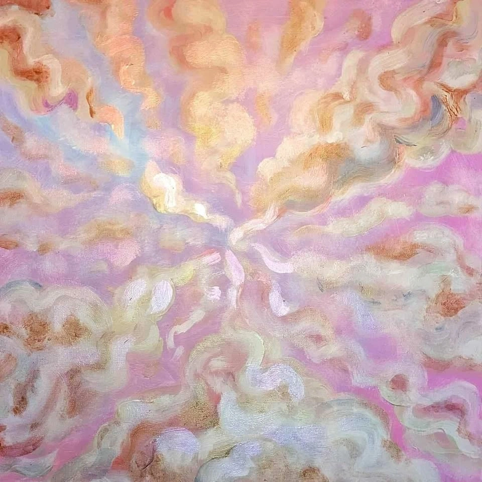 Large iridescent cloud landscape painting, holographic and changes colours as you walk by.