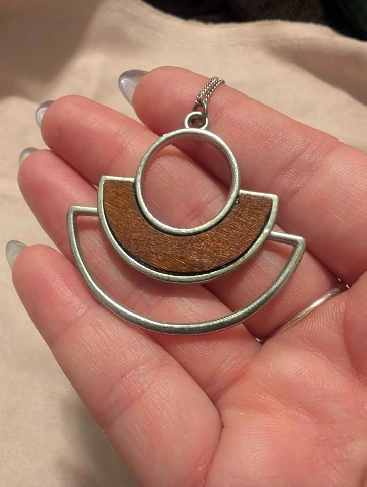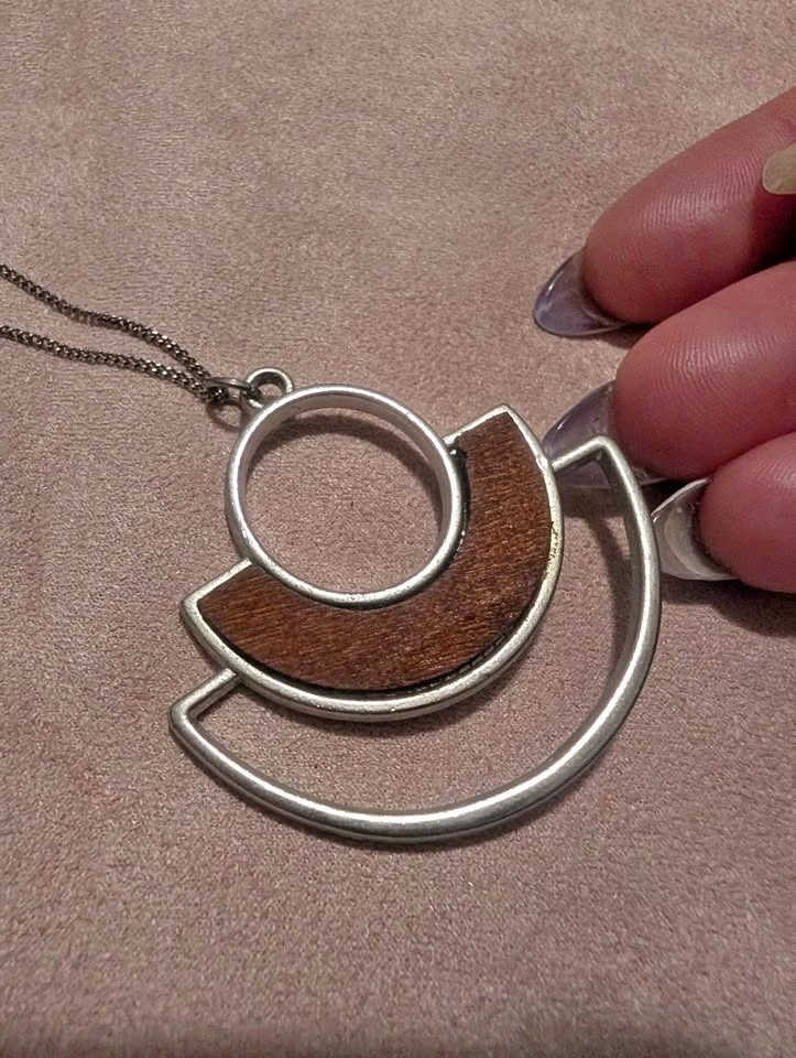 Sterling Silver necklace with Geometric silver pendant with wood detailing. Wood piece has a soft shimmery finish in the light. Chain is stamped 925.