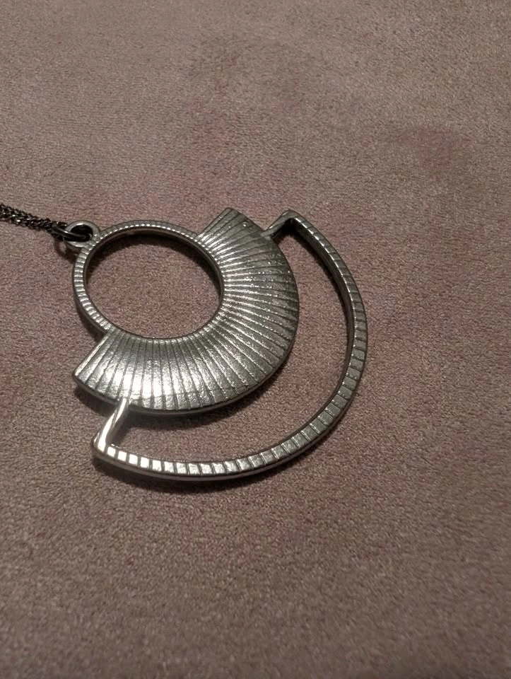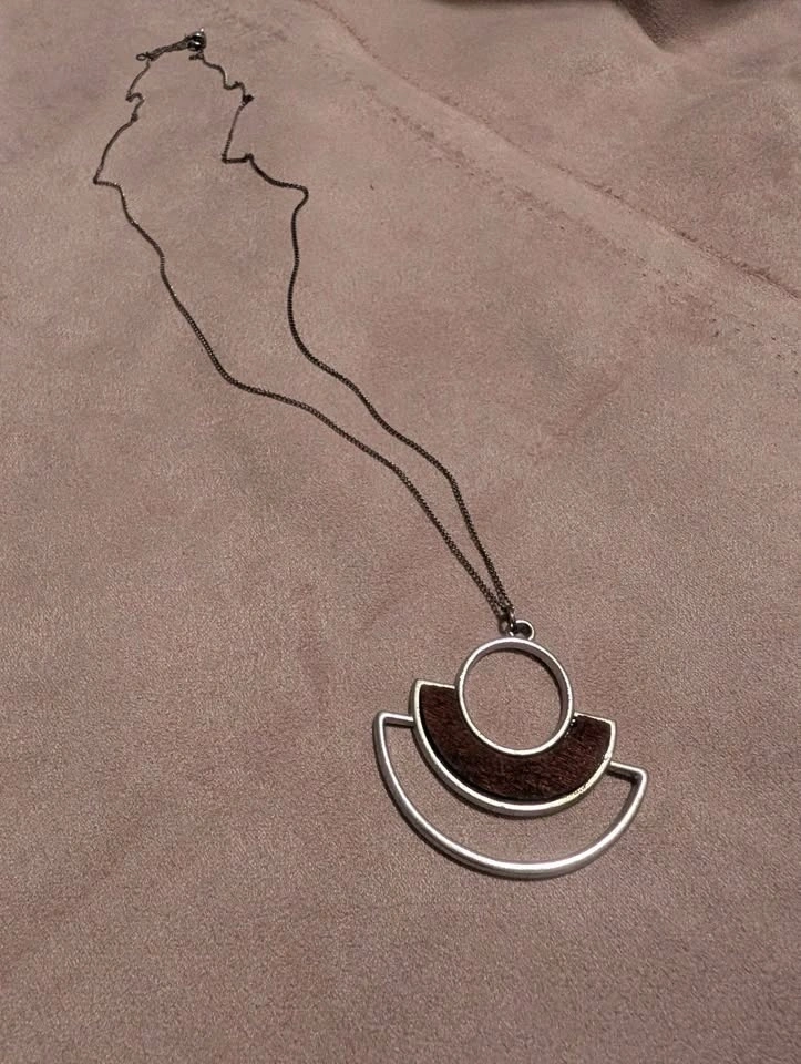 Sterling Silver necklace with Geometric silver pendant with wood detailing. Wood piece has a soft shimmery finish in the light. Chain is stamped 925.