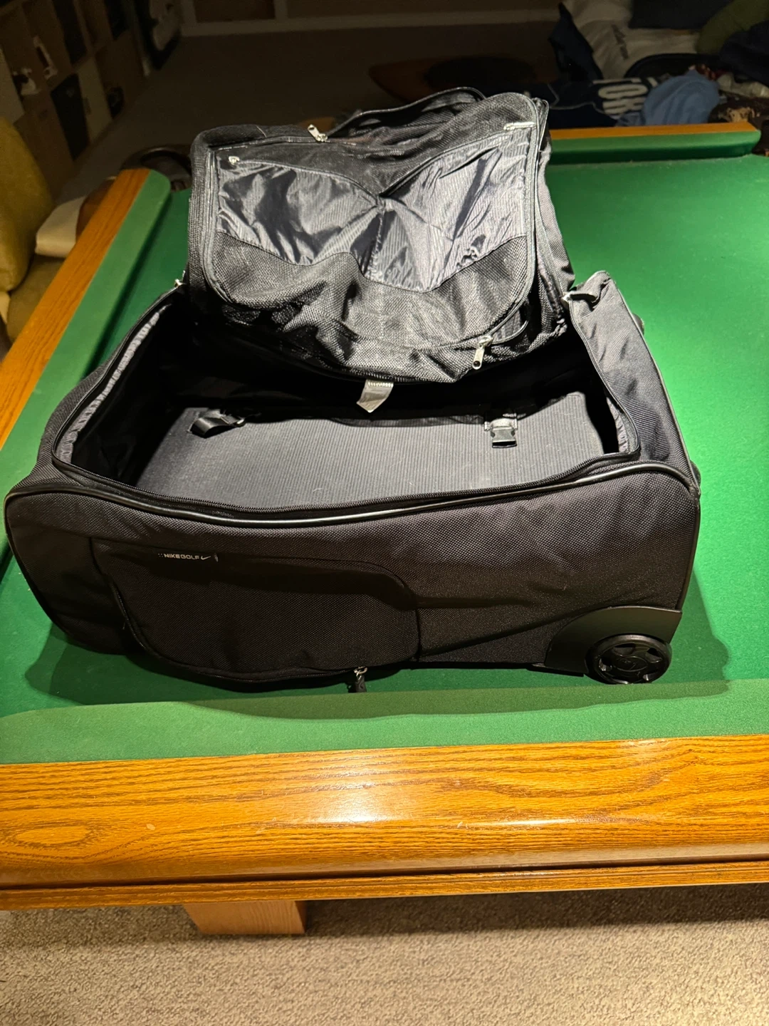 Selling a Nike Golf rolling suitcase in black. It has some signs of use, but is still in good condition and ready for your next trip to the golf course or wherever you're headed!