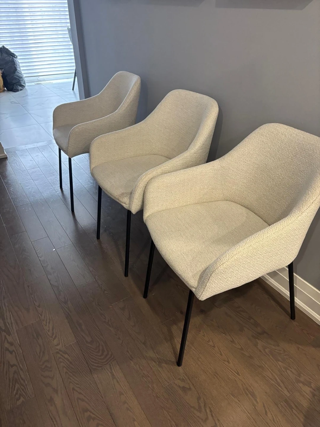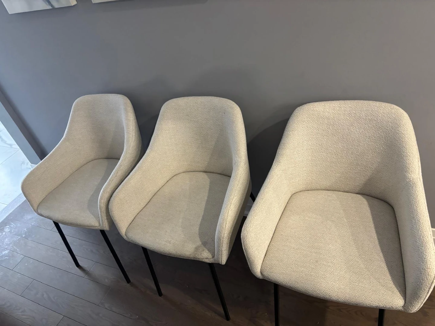 Selling a set of three dining chairs. They feature a neutral beige fabric and black legs. Perfect for adding a touch of modern style to your dining space!