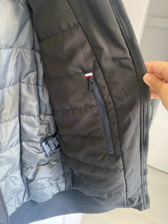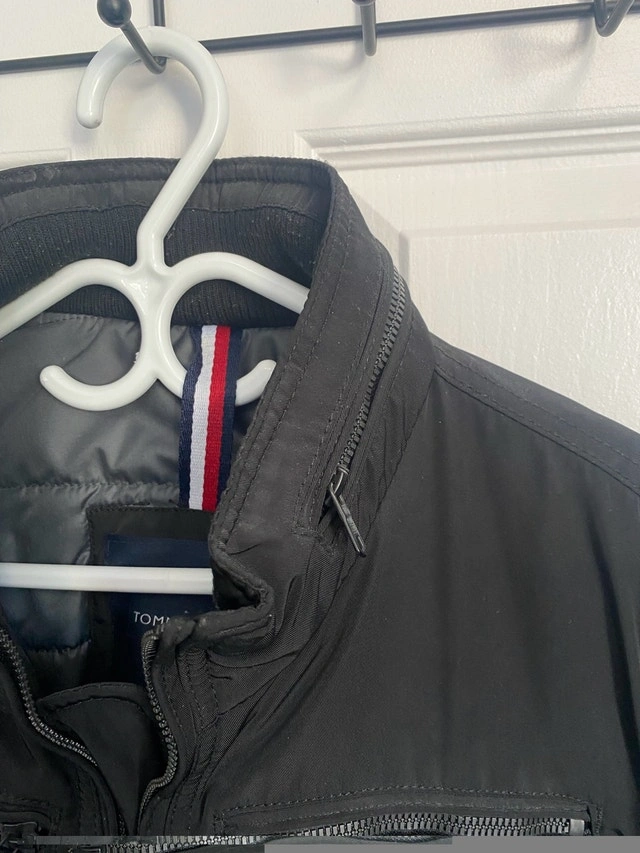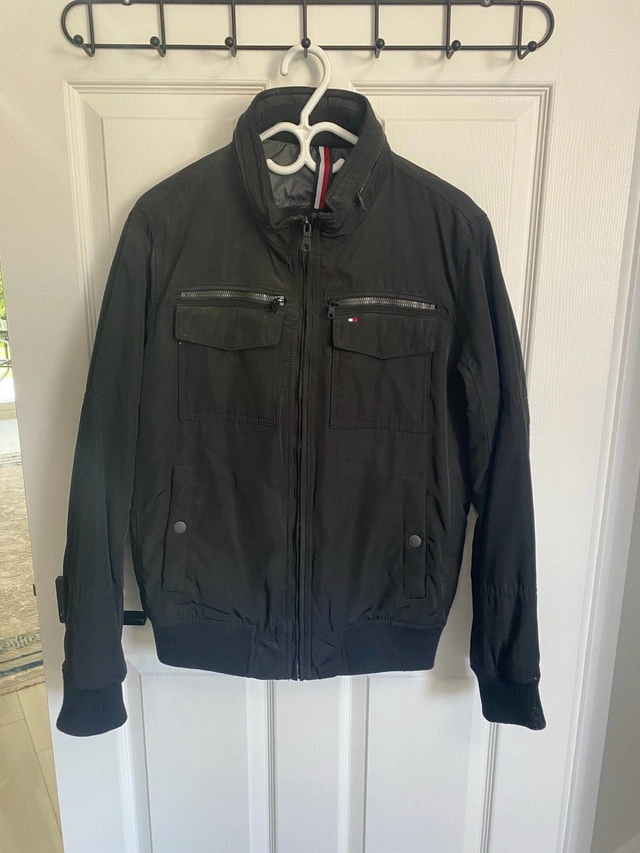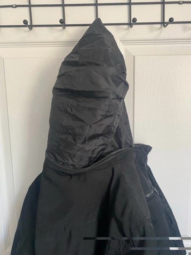 Nice spring men’s jacket with inside pocket and zipper opens up to a hood as pictured. Size small.