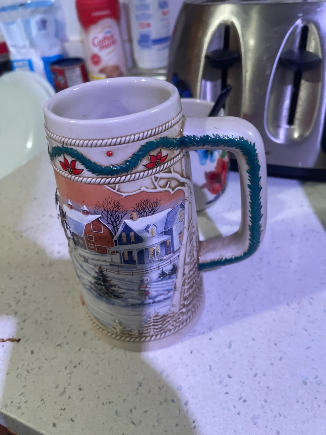 Selling a Budweiser Clydesdales holiday stein mug. It features a winter scene with the iconic Clydesdale horses and a festive holiday design. Perfect for collectors or anyone who enjoys a unique mug!