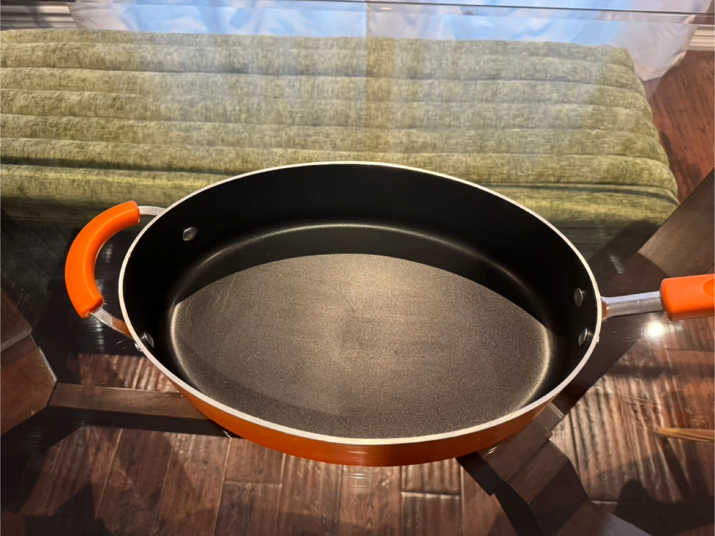 Gently used 5-quart capacity pan. The unique oval shape is great for stovetop space and fits long pasta or large cuts of meat perfectly. Non-stick surface is very clean. Includes matching glass lid.
