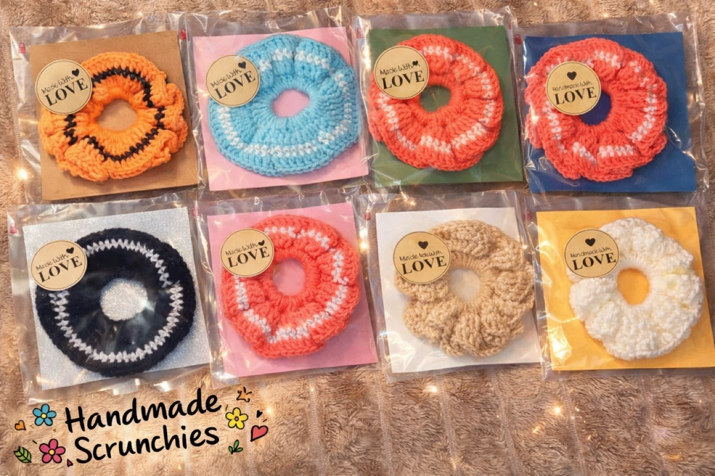 Homemade crochet scrunchies made with soft, comfortable yarn that’s gentle on your hair. Each scrunchie is handmade, so every single one is unique!
