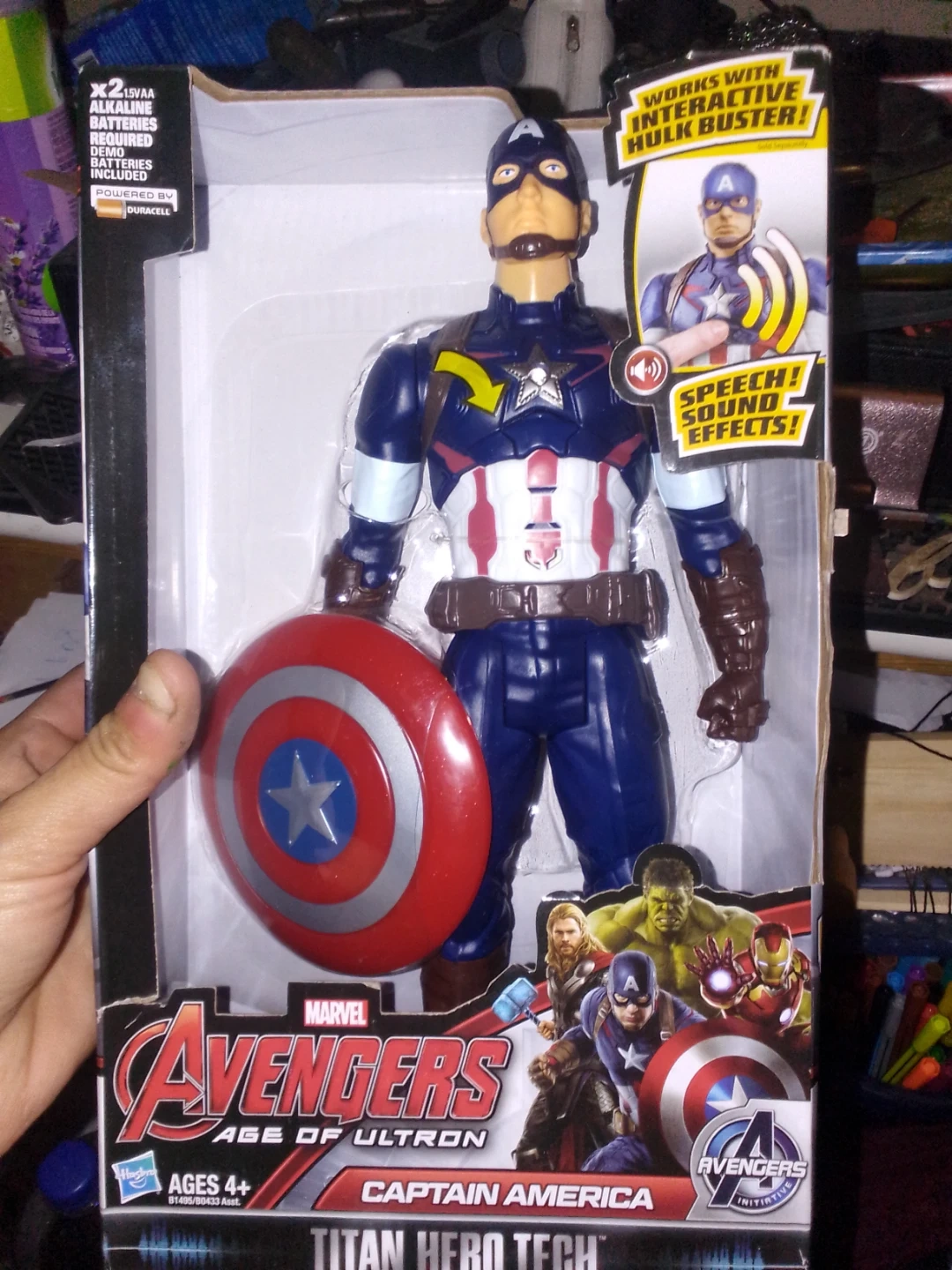 Selling a Marvel Avengers Age of Ultron Captain America Titan Hero Tech action figure! It works with interactive Hulk Buster, and also features speech and sound effects. It requires 2 1.5V AA alkaline batteries, demo batteries included, powered by Duracell. Recommended for ages 4+