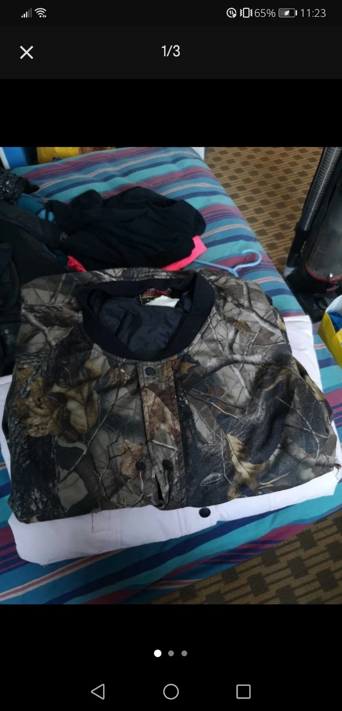 Here's a Canada Weathergear Super Triple Goose jacket. It's designed in Canada and has a distinctive red logo. It's a size lg It maintains warmth down to -30°C ~ -40°C and camo winter coat size lg as well