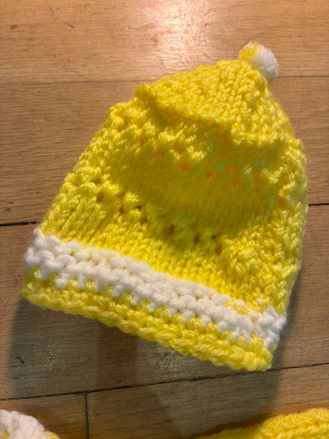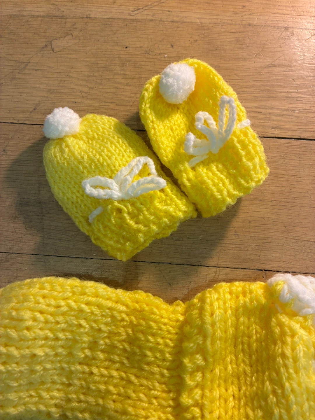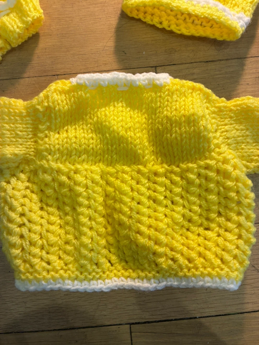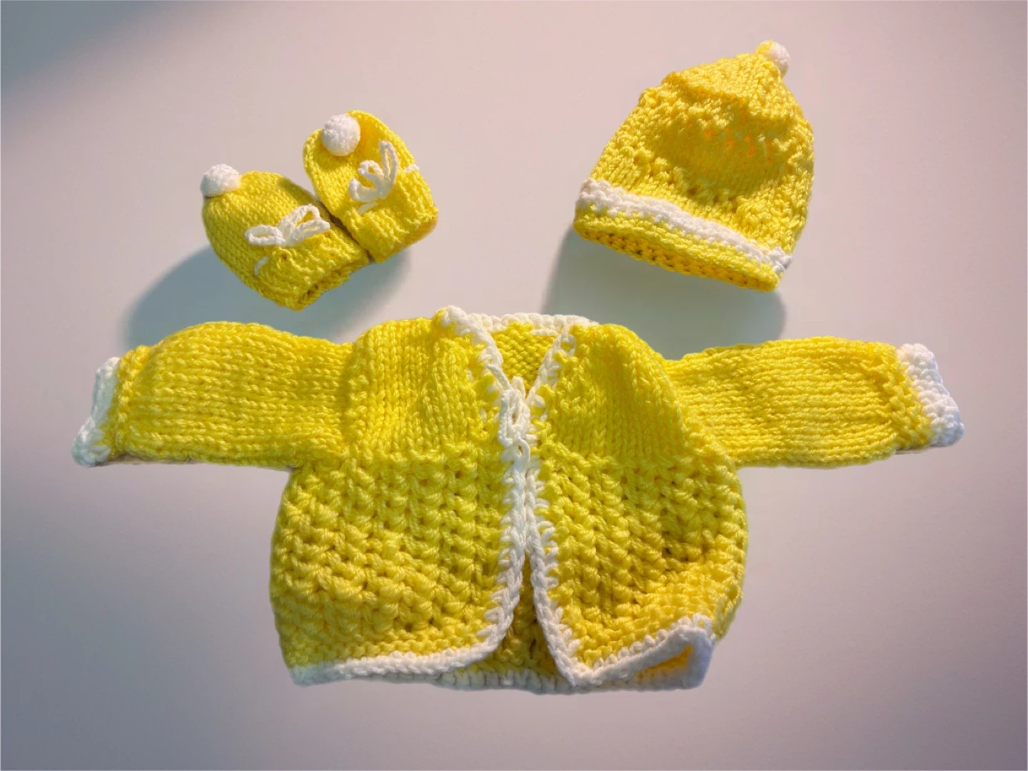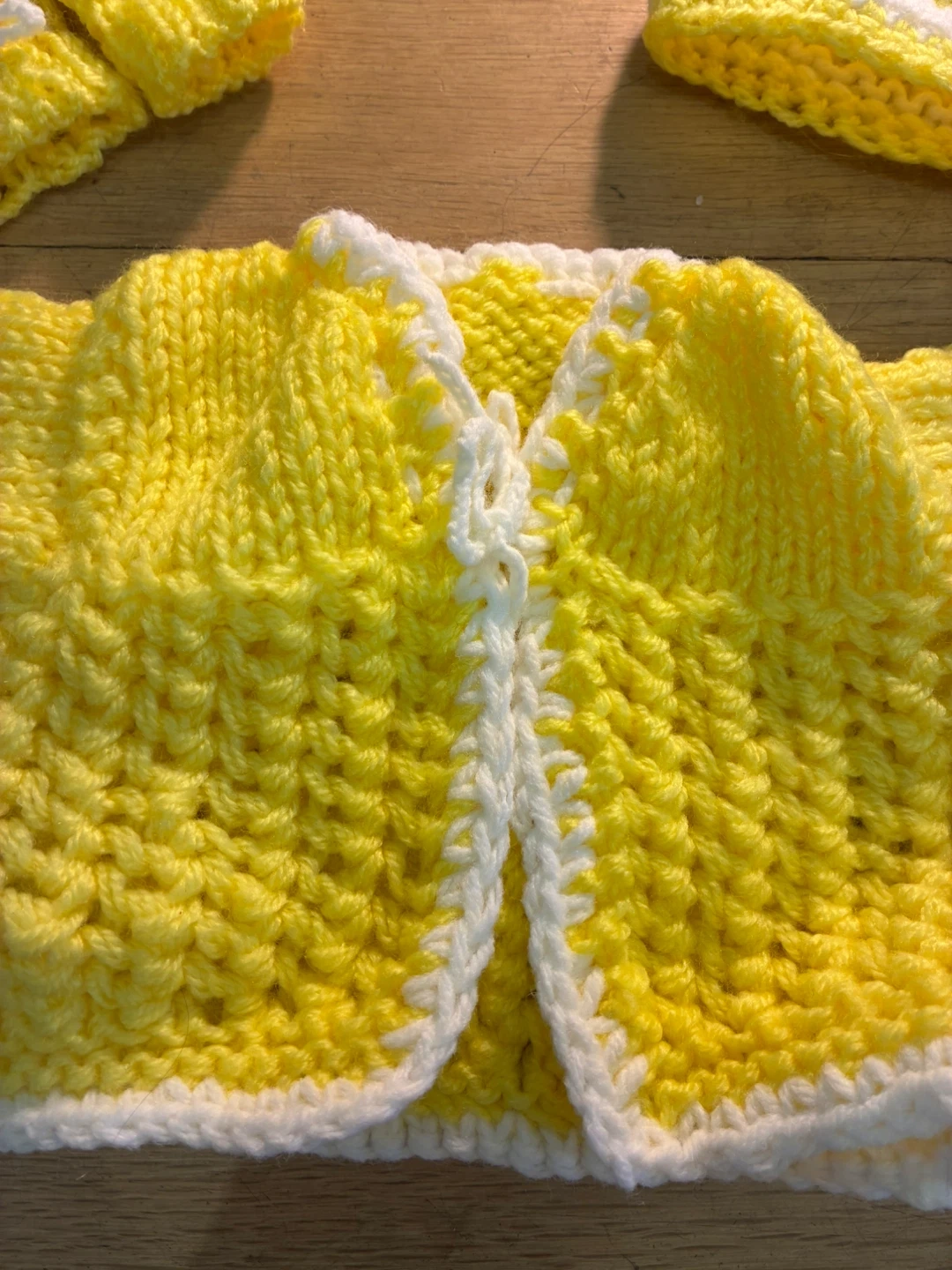 This adorable hand-knitted baby outfit is brand new and ready for a little one! The set includes a cardigan, hat, and booties, all in a bright yellow colour with white trim. It's a cozy and cute set for a newborn.
