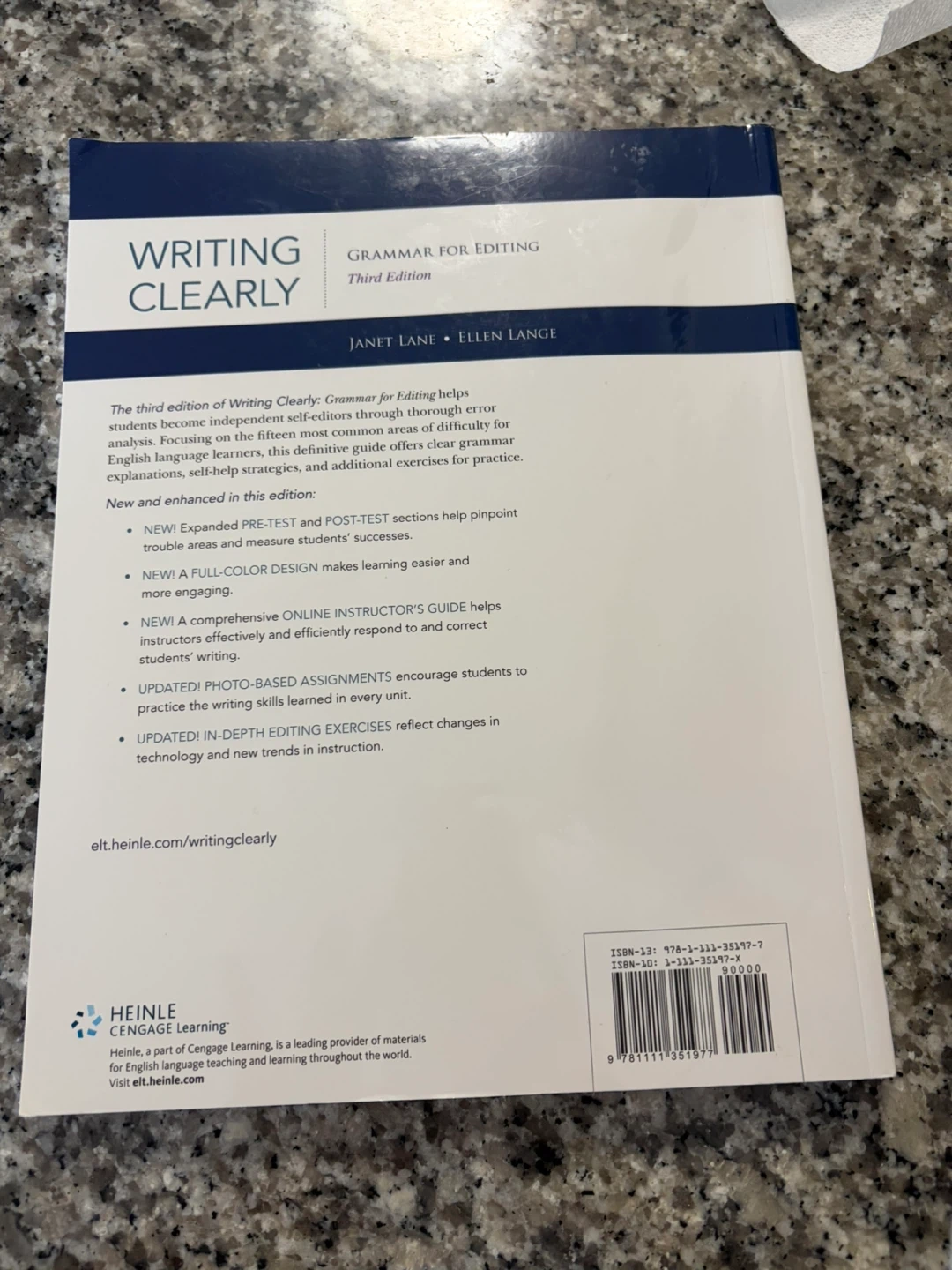 Selling "Writing Clearly: Grammar for Editing, Third Edition" by Janet Lane and Ellen Lange. This book is great for students looking to improve their grammar and editing skills. It includes new pre-test and post-test sections, a full-colour design, a comprehensive online instructor's guide, photo-based assignments, and in-depth editing exercises. Perfect for anyone studying English language or teaching!