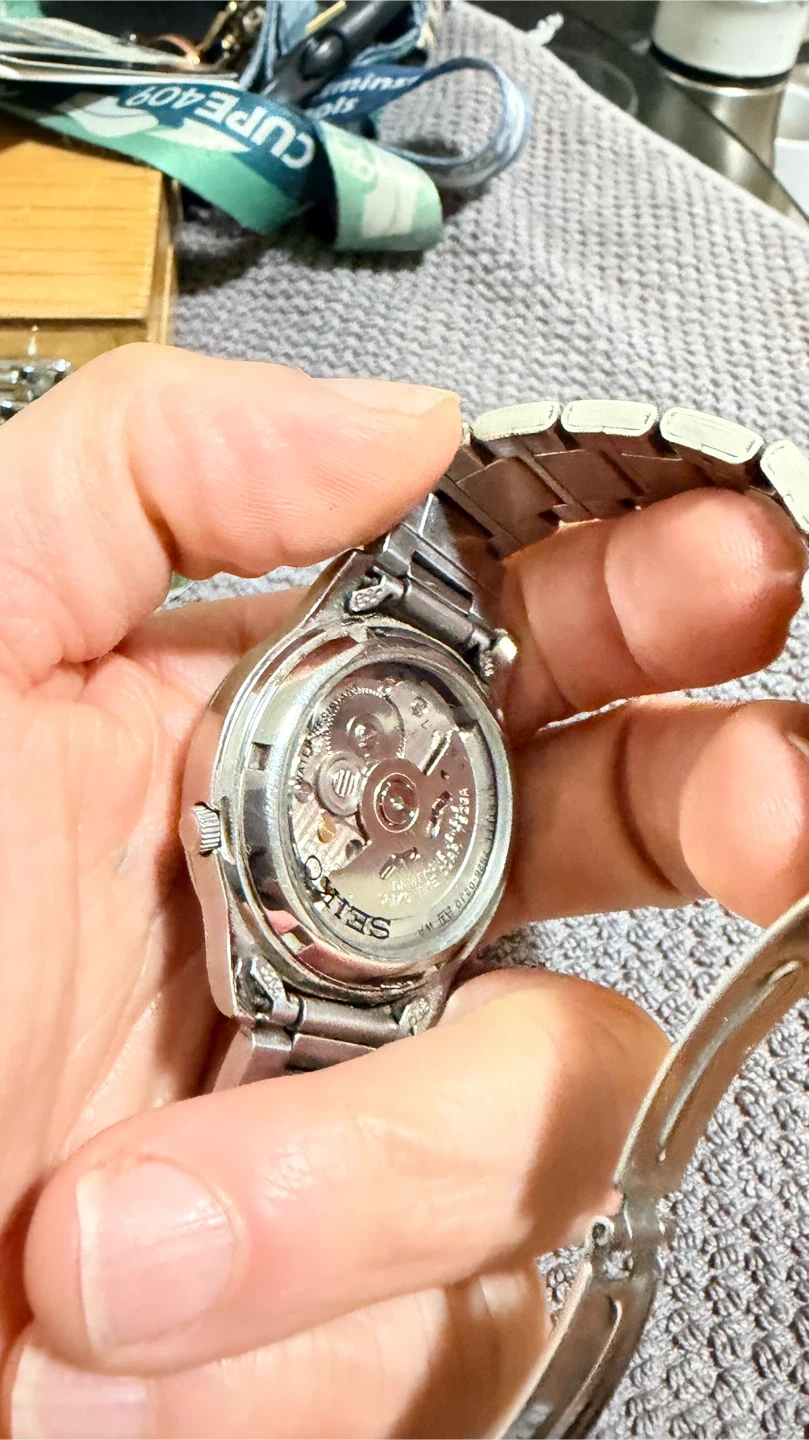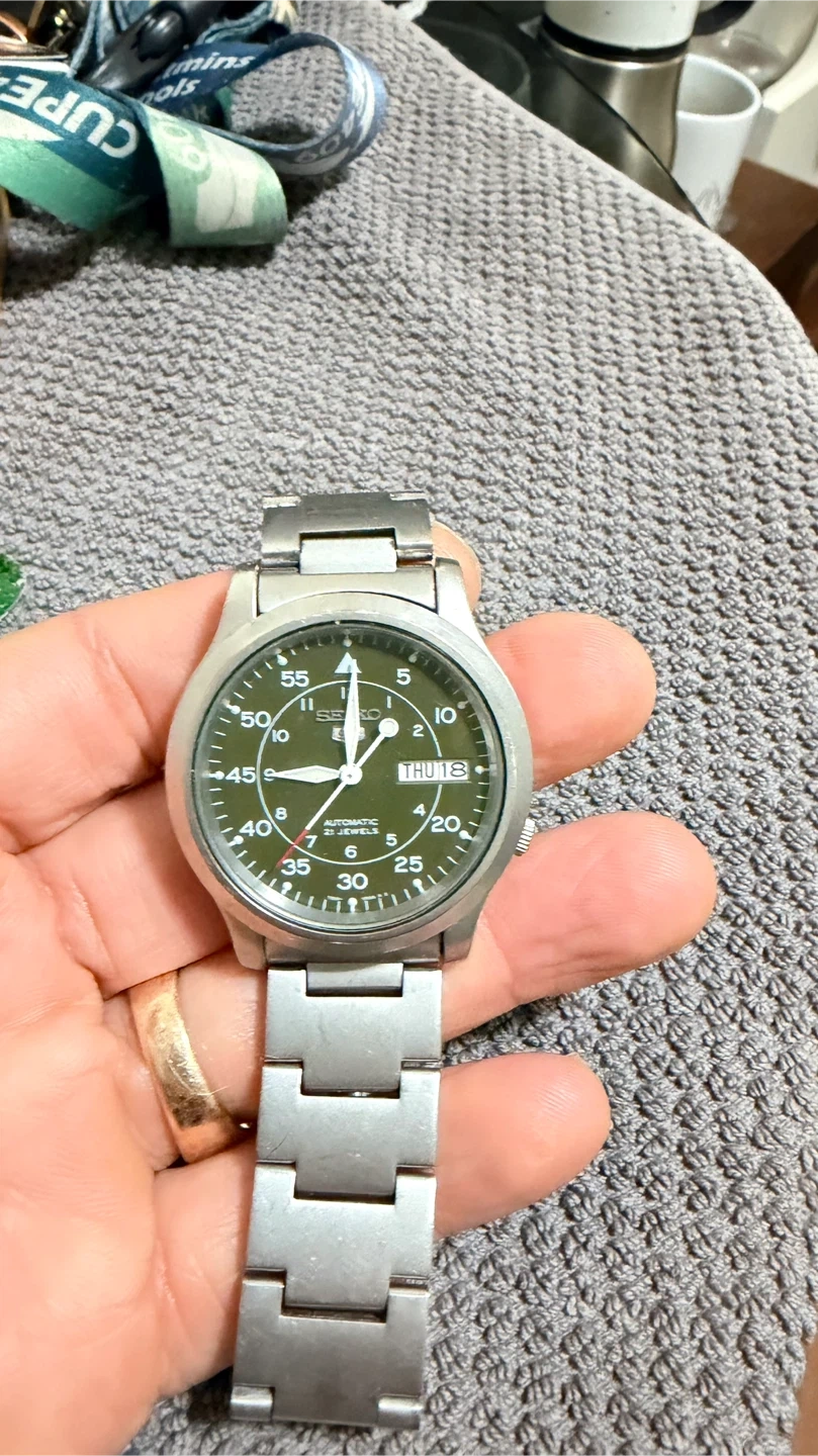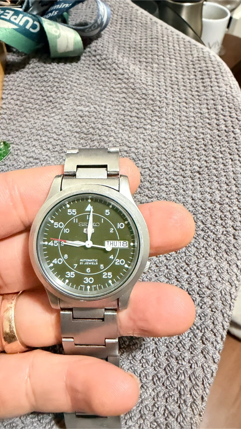 Selling a Seiko 5 automatic watch with a cool olive green face. It's an automatic, so no need for batteries! The watch has a stainless steel band and a day/date display. It's in great shape and ready for a new wrist!