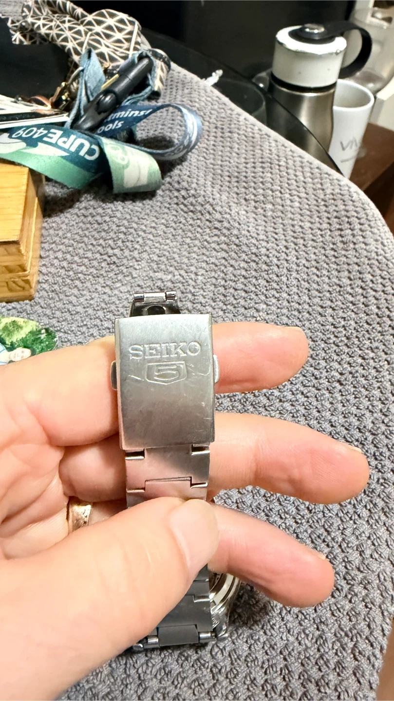 Selling a Seiko 5 automatic watch with a cool olive green face. It's an automatic, so no need for batteries! The watch has a stainless steel band and a day/date display. It's in great shape and ready for a new wrist!