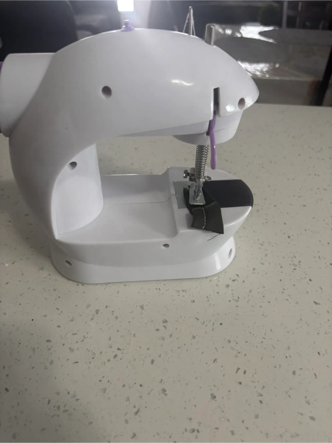I'm selling a mini sewing machine, model SM-202A. It's white with purple accents and comes with its original box! Also included are the foot pedal and some bobbins. It's practically convenience, big value!