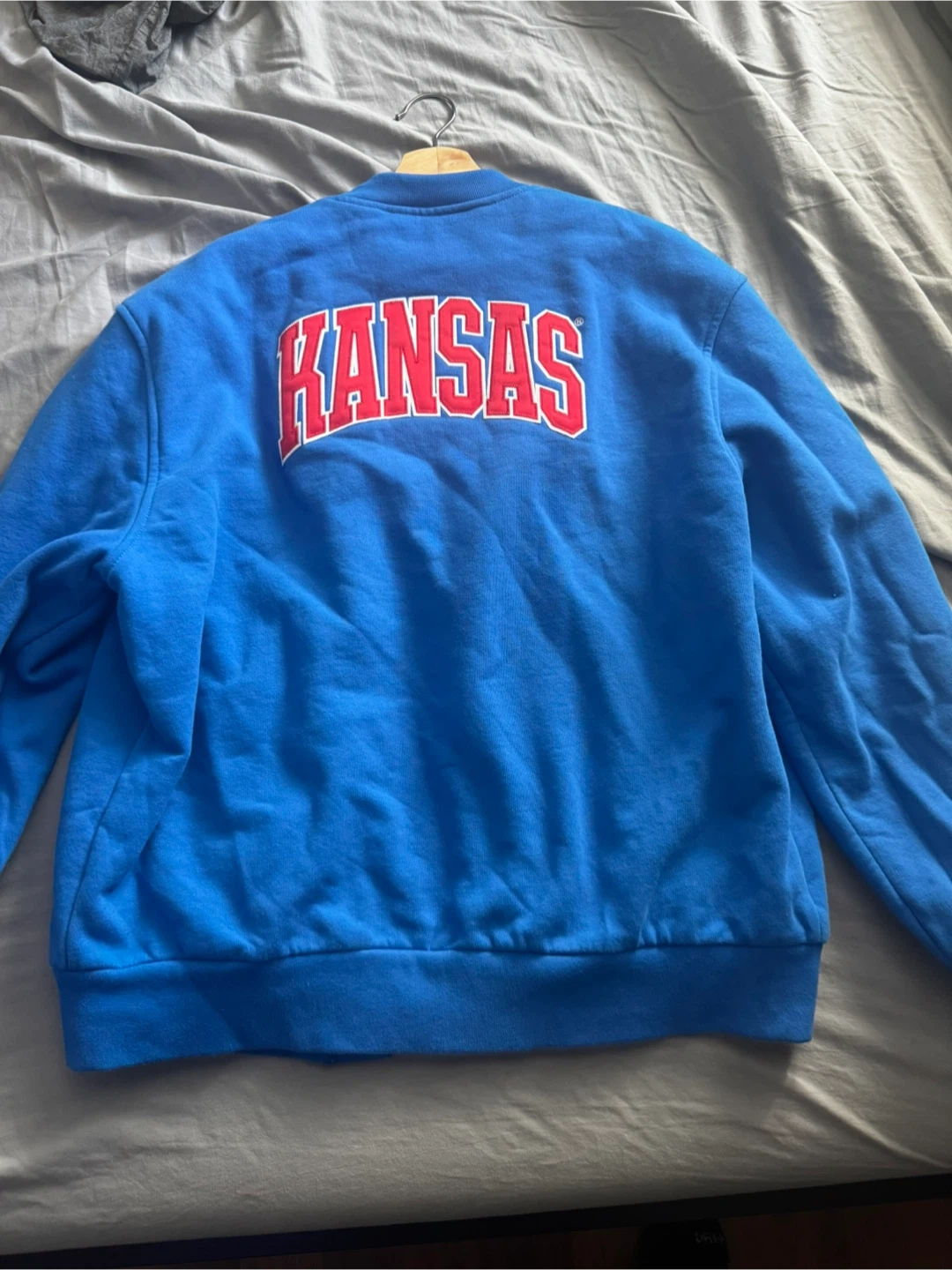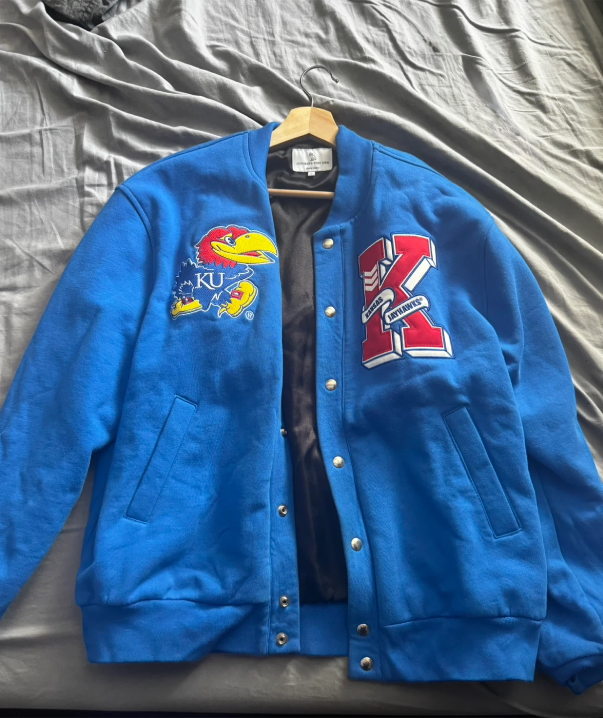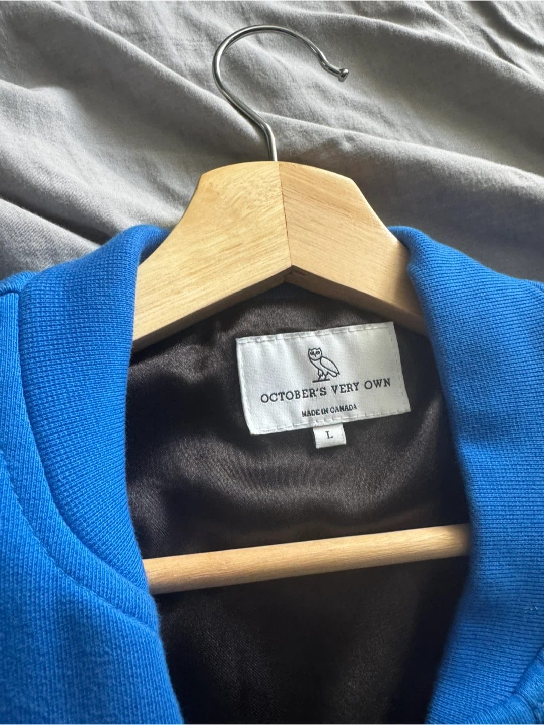 Selling a blue October's Very Own (OVO) bomber jacket, size large! It features the Kansas Jayhawks logo and "KANSAS" on the back. Made in Canada, this jacket is in great condition and ready for a new owner!