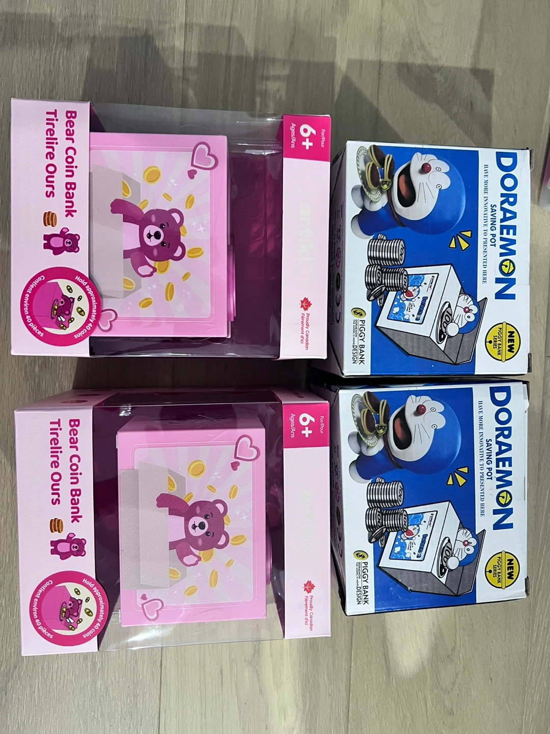 I have a new Bear Coin Bank and Doraemon Saving Pot available! They are both in their original packaging and ready to help your little ones save their coins. The Bear Coin Bank is pink and features a cute bear design, and the Doraemon Saving Pot features the popular character Doraemon