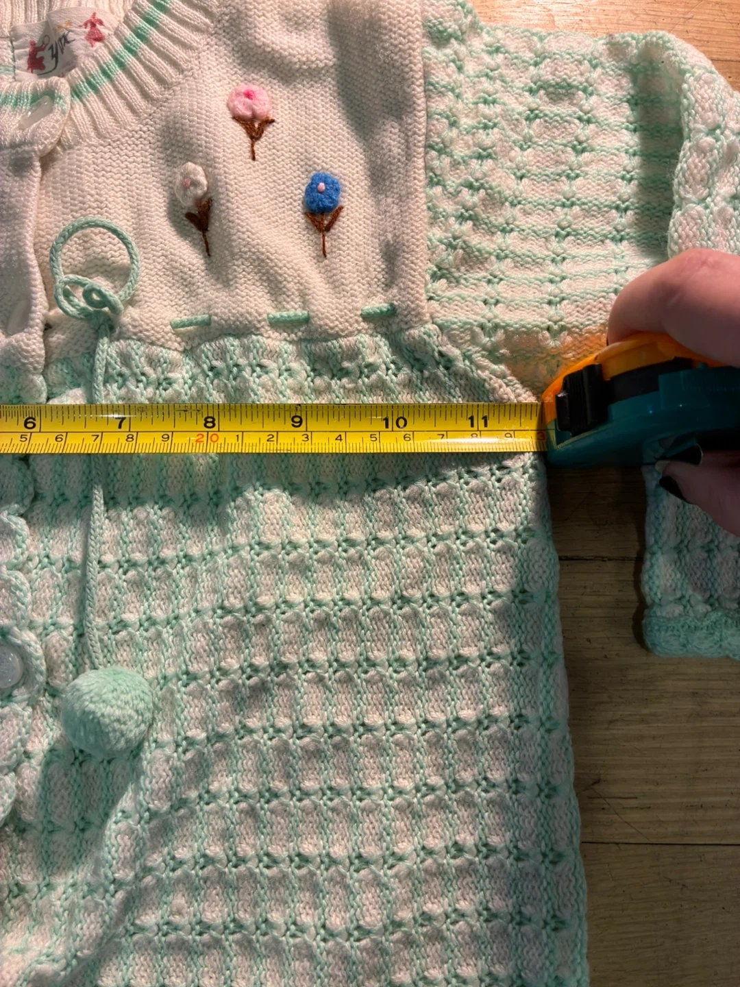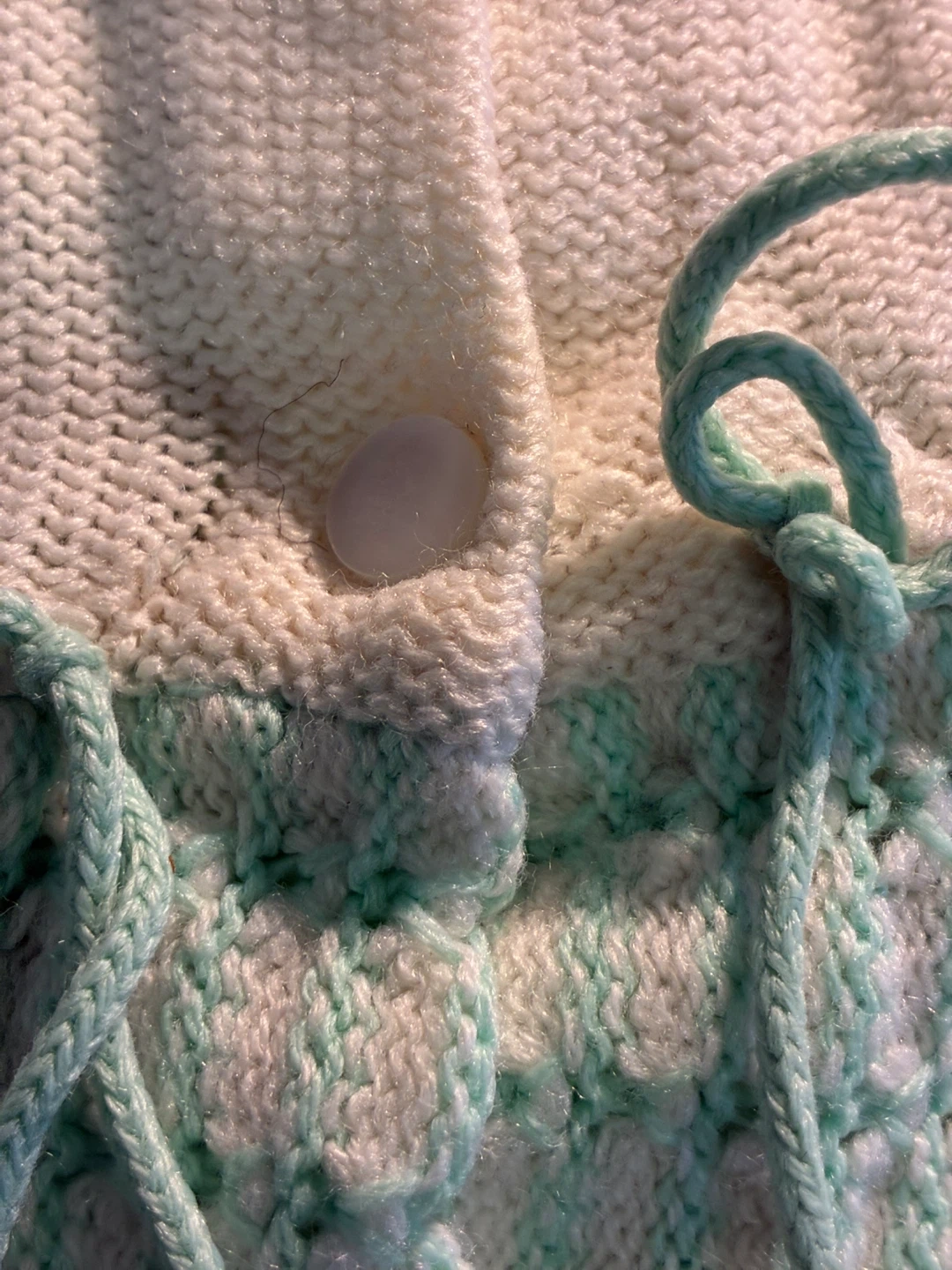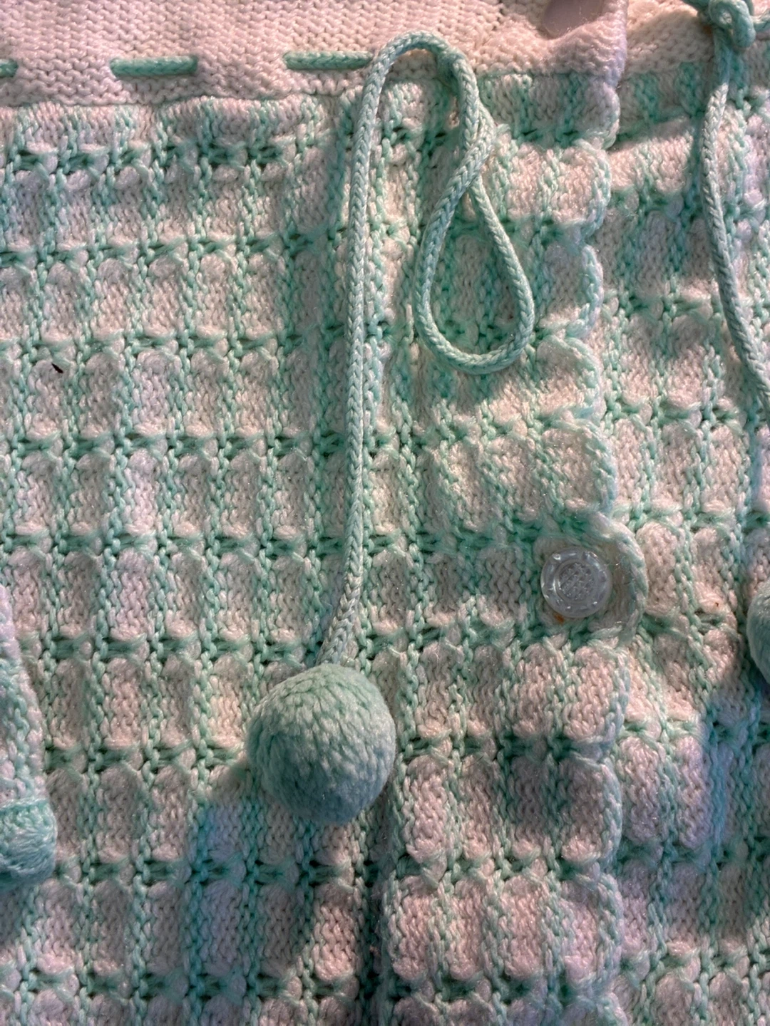 Check out this sweet little knit baby cardigan! It's in great condition and features a lovely mint and white pattern. The cardigan also has cute little flower details on the front. Perfect for keeping your little one cozy and stylish!
