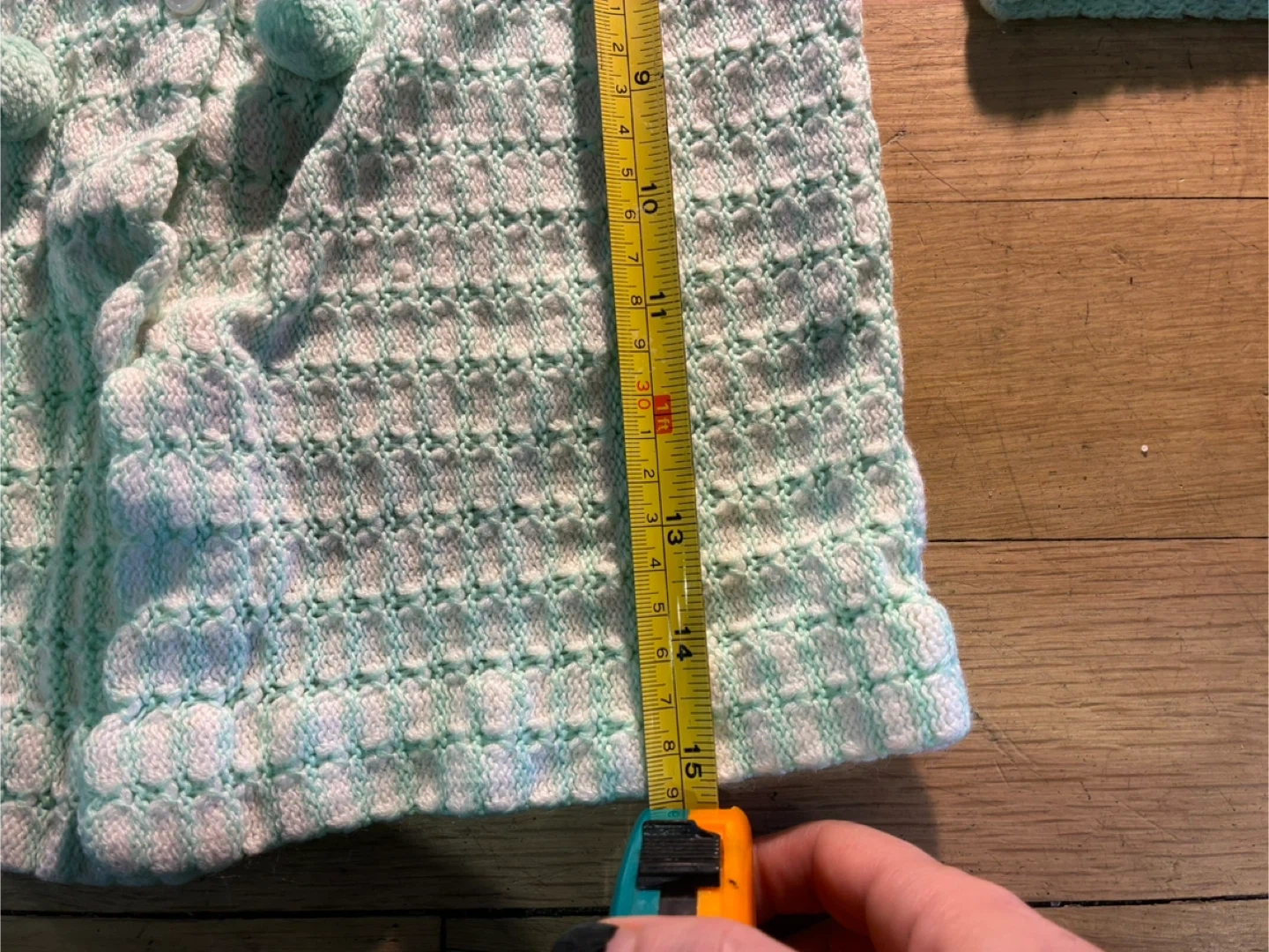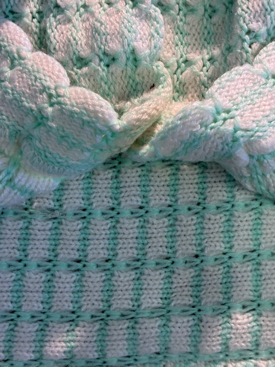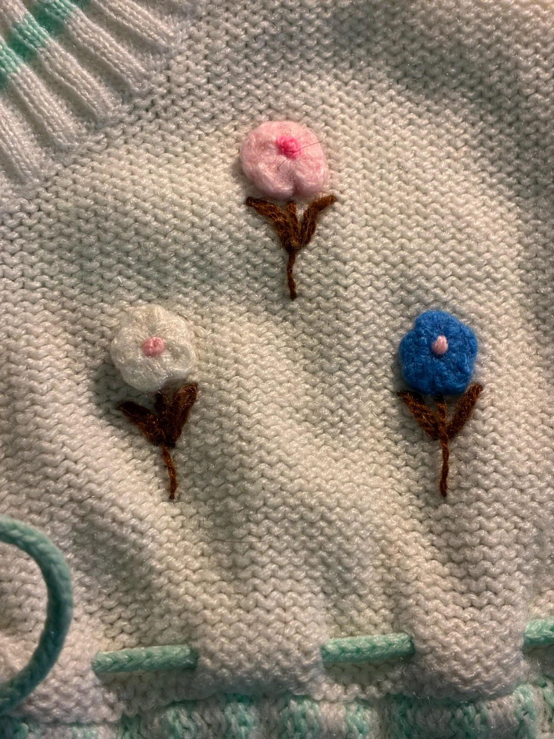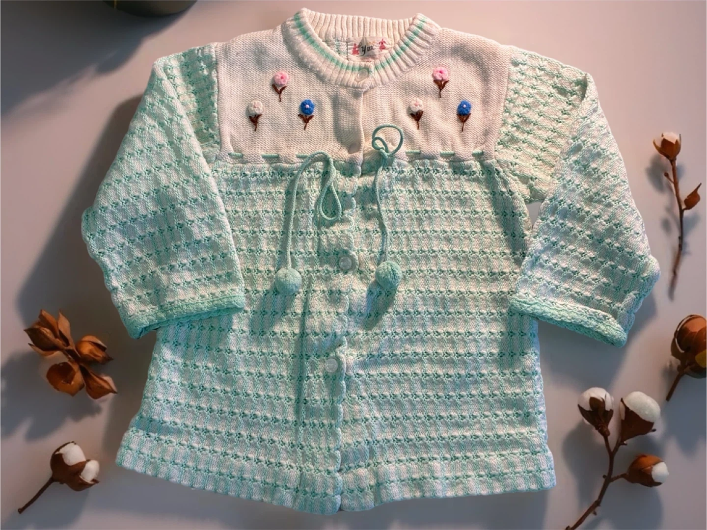 Check out this sweet little knit baby cardigan! It's in great condition and features a lovely mint and white pattern. The cardigan also has cute little flower details on the front. Perfect for keeping your little one cozy and stylish!