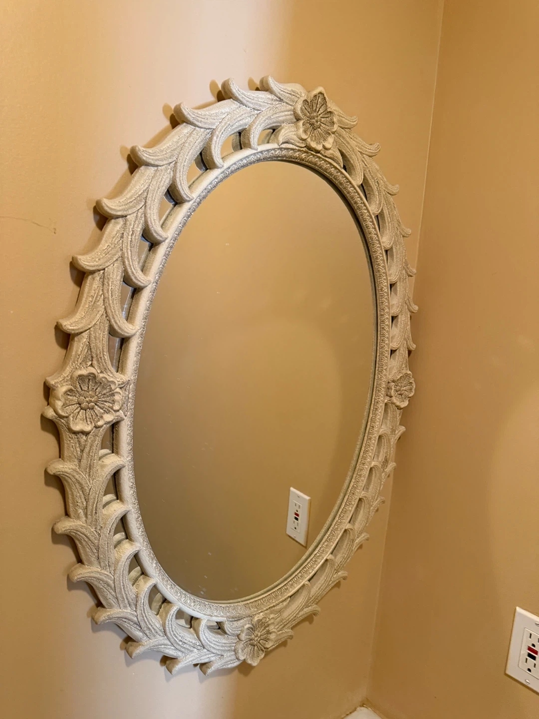 Selling a lovely oval decorative wall mirror. It has a beautiful floral design around the frame. It's in great condition and would add a touch of elegance to any room