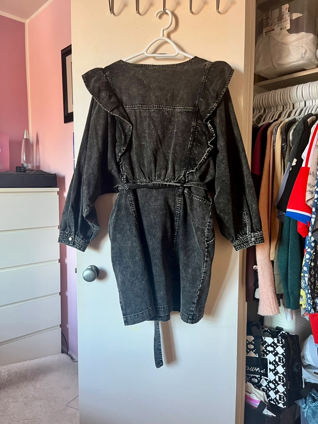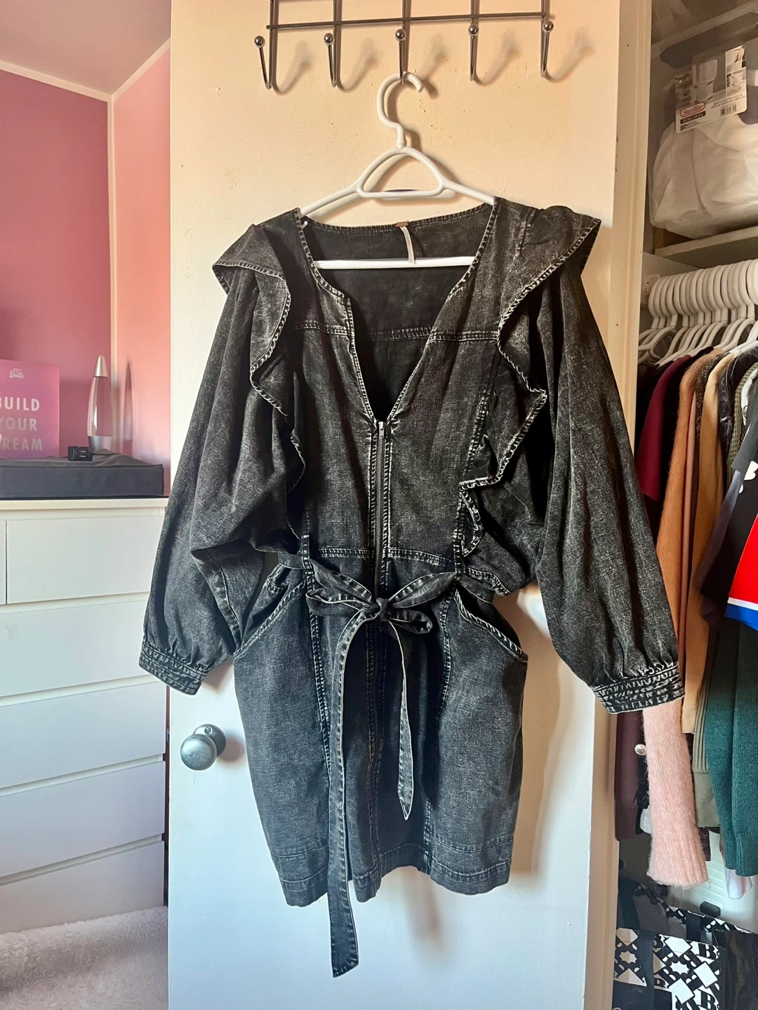 Here's a stylish black denim mini dress from Free People! It features a unique ruffle design and a flattering tie waist. The dress is a size XL. It's new, never worn and ready for a new home!