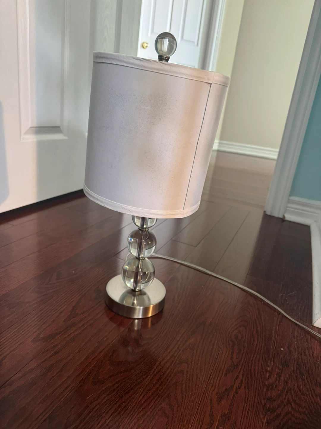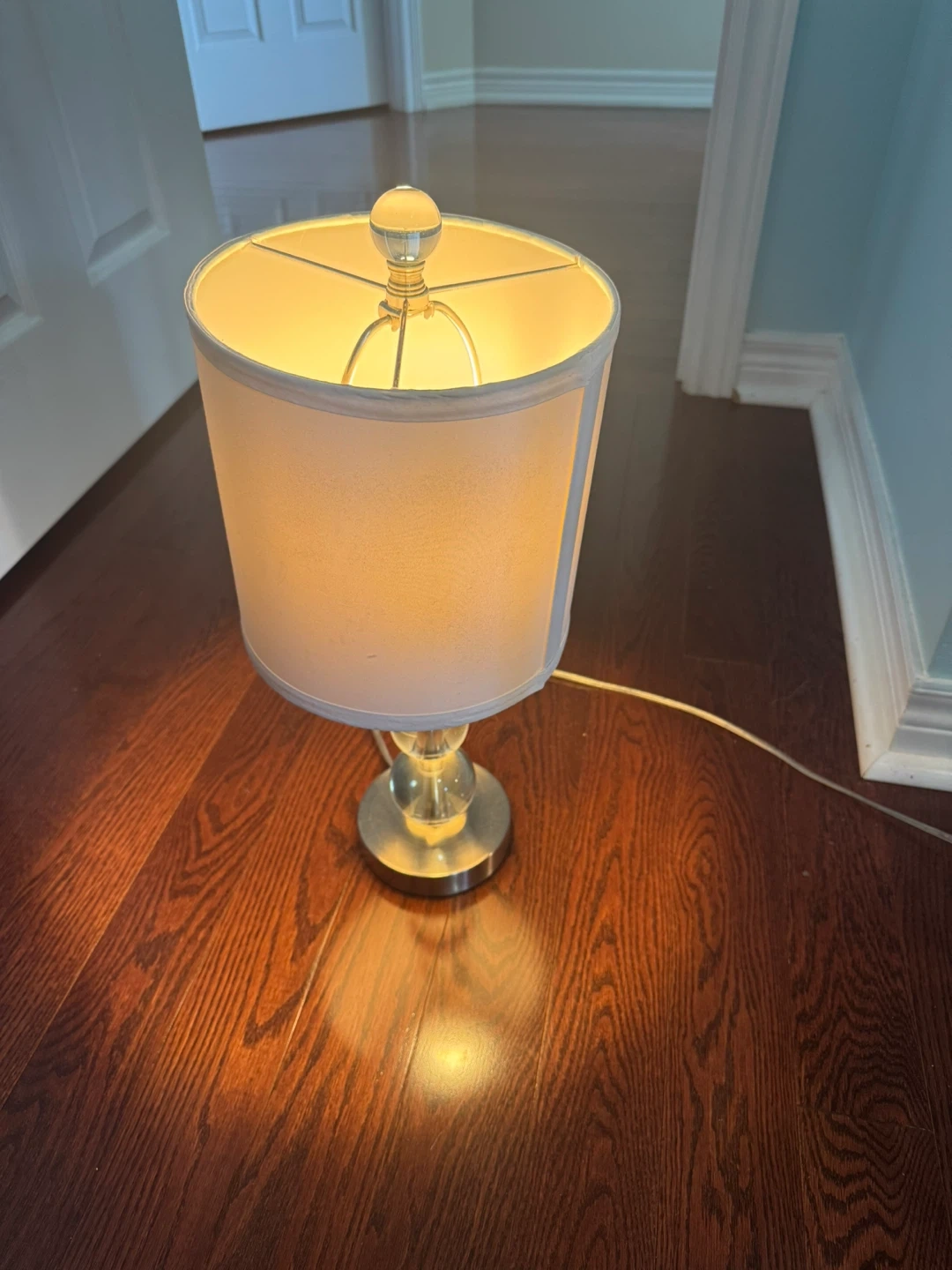 Here's a lovely table lamp that would look great in any room! It features a white shade and a decorative glass base. It's in good condition and ready to brighten up your space