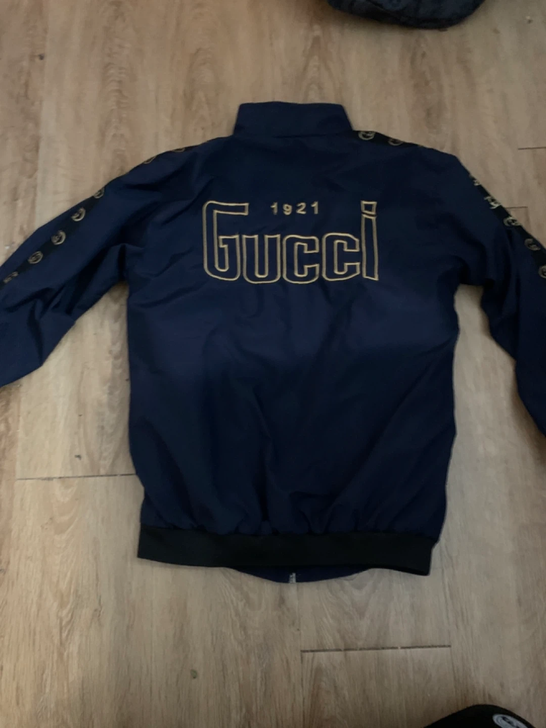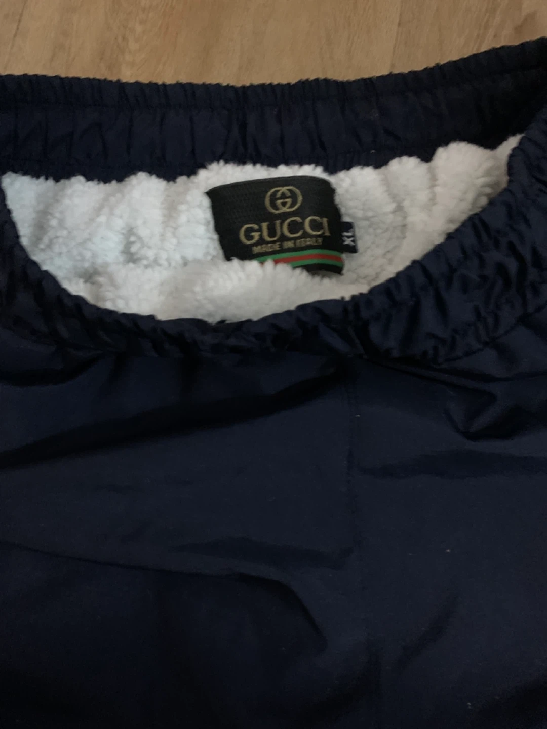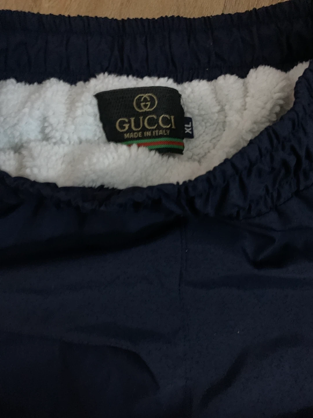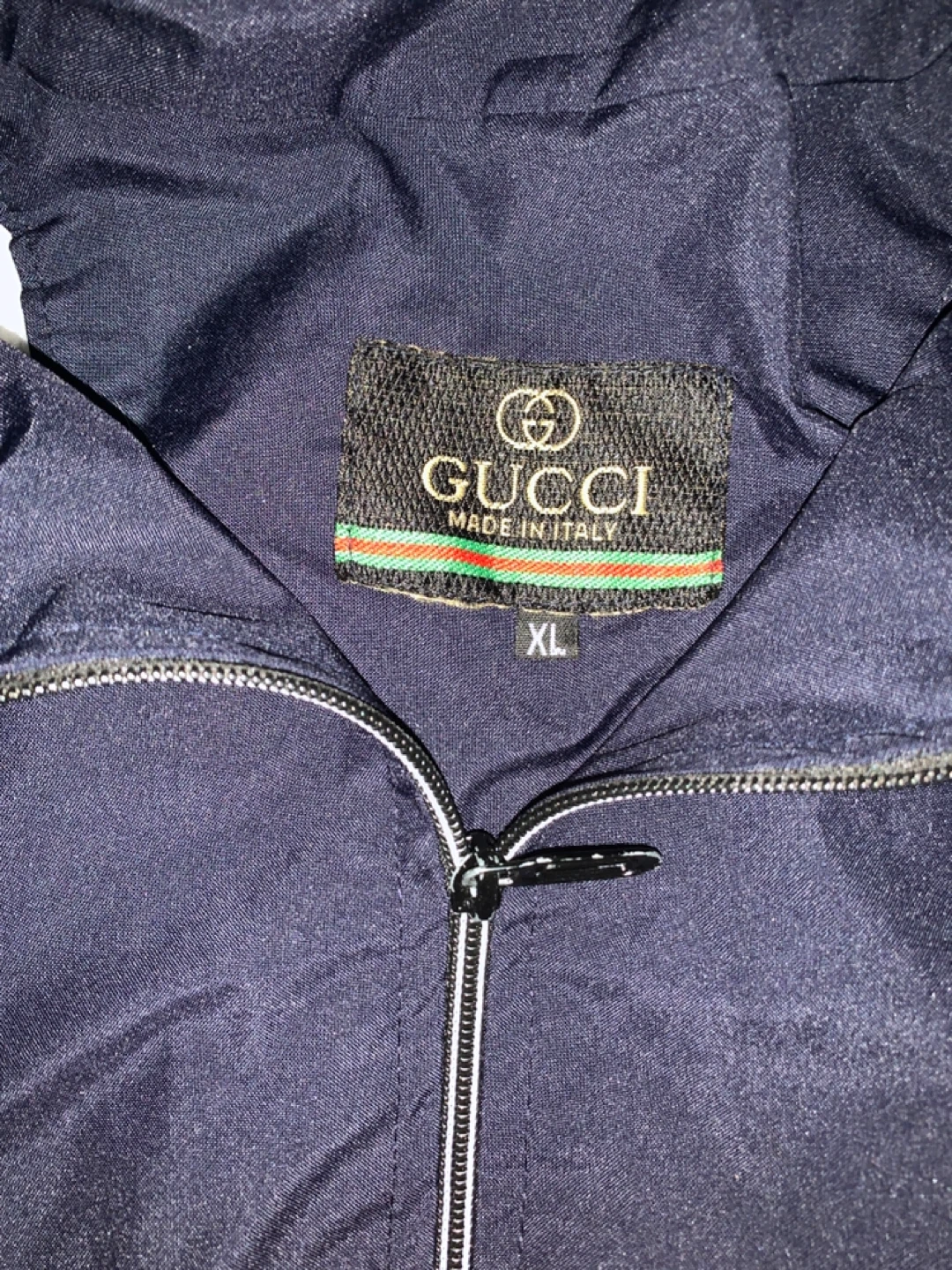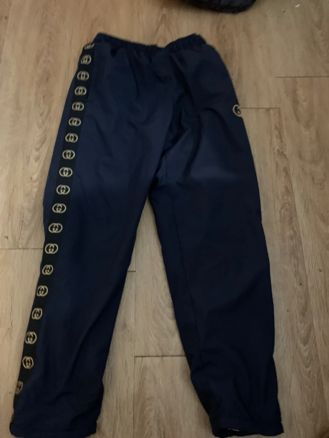 Selling a Gucci tracksuit in size XL. It's a navy blue colour and features the Gucci logo on the sides of the pants and on the jacket. Made in Italy