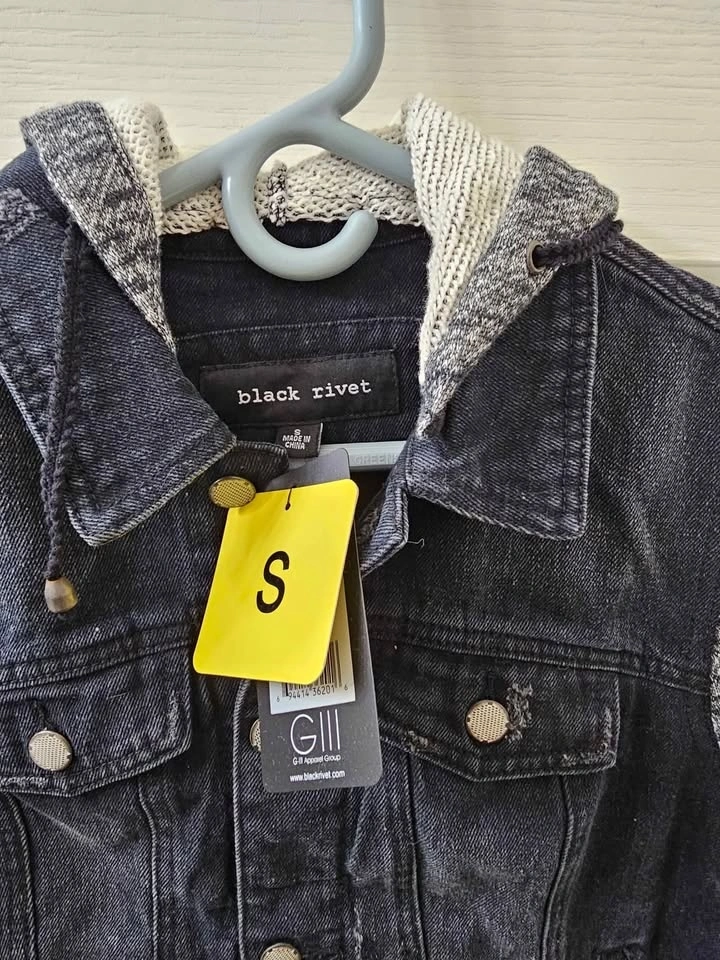 Brand new with tags Black Rivet Distressed Style Jacket. Size Small. Removable hood.