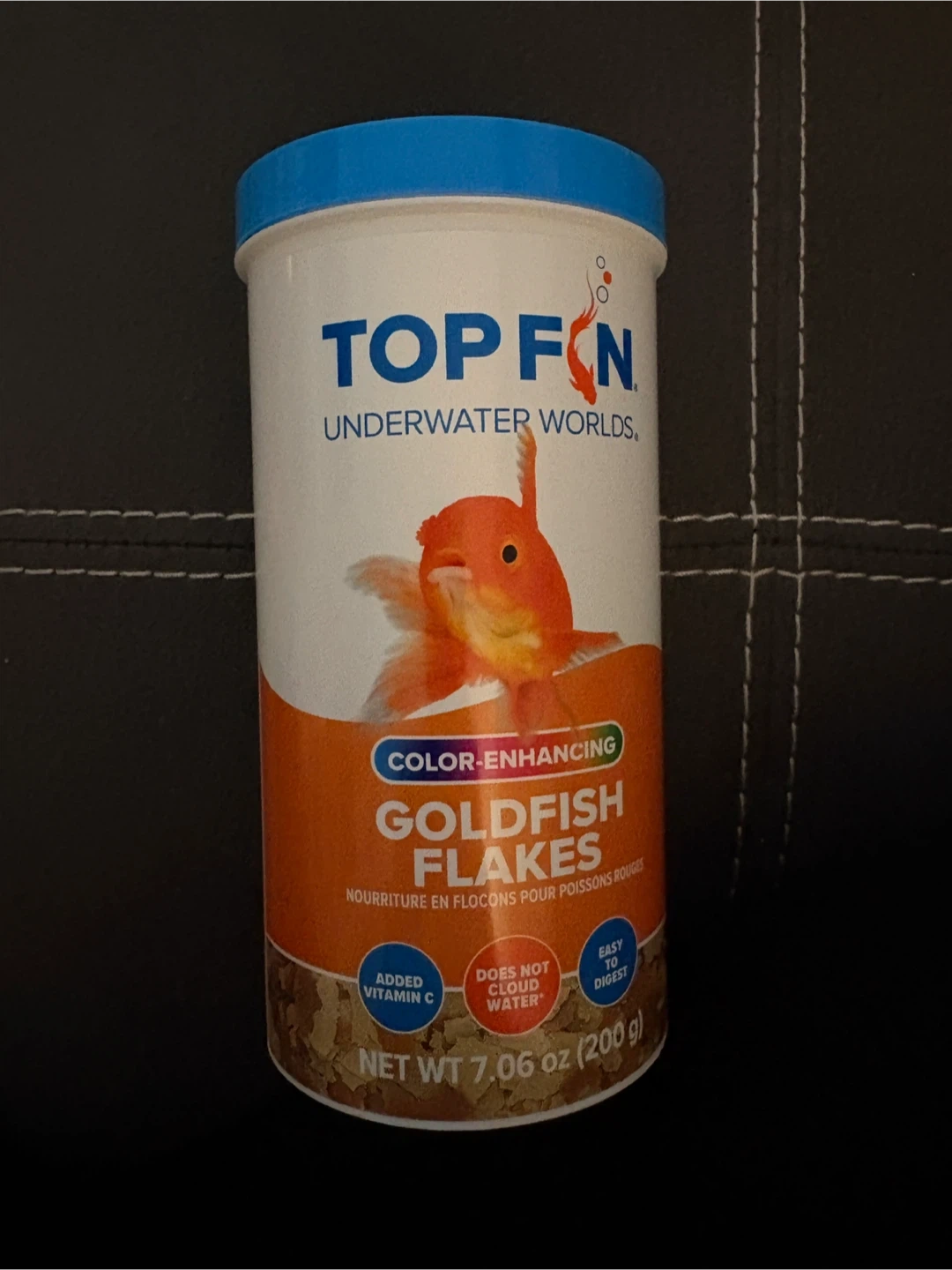 I have a container of Top Fin Goldfish Flakes! It's a color-enhancing food that's easy to digest and doesn't cloud the water. It also has added Vitamin C! The expiry date is August 2027