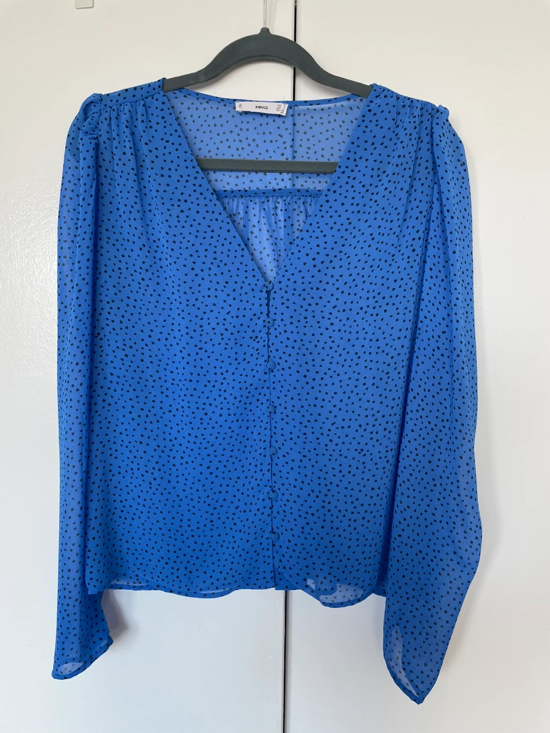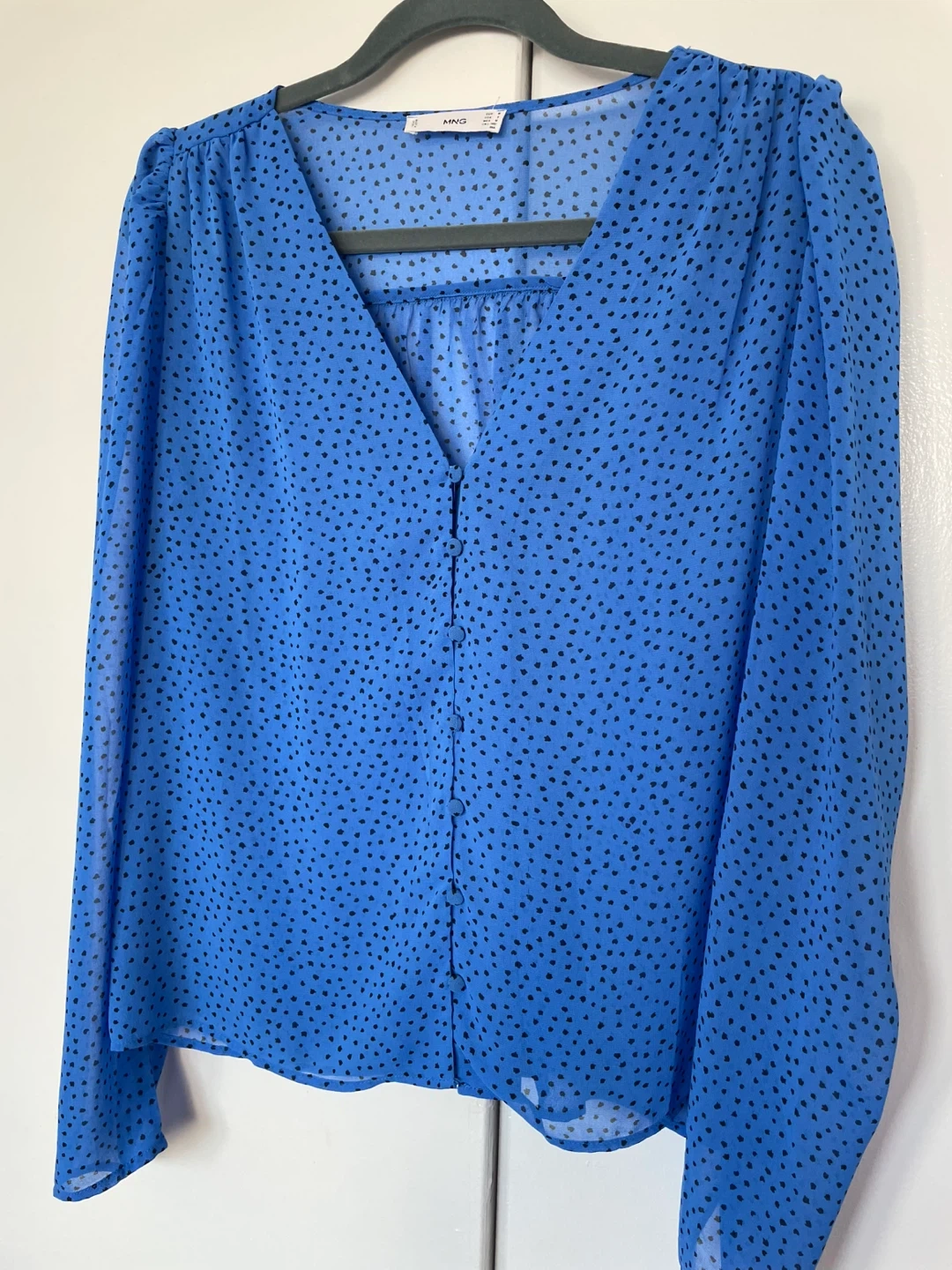 Selling a cute MNG blouse in a bright blue colour with black polka dots! It's a size M and has long sleeves. Perfect for dressing up or down, and in great condition