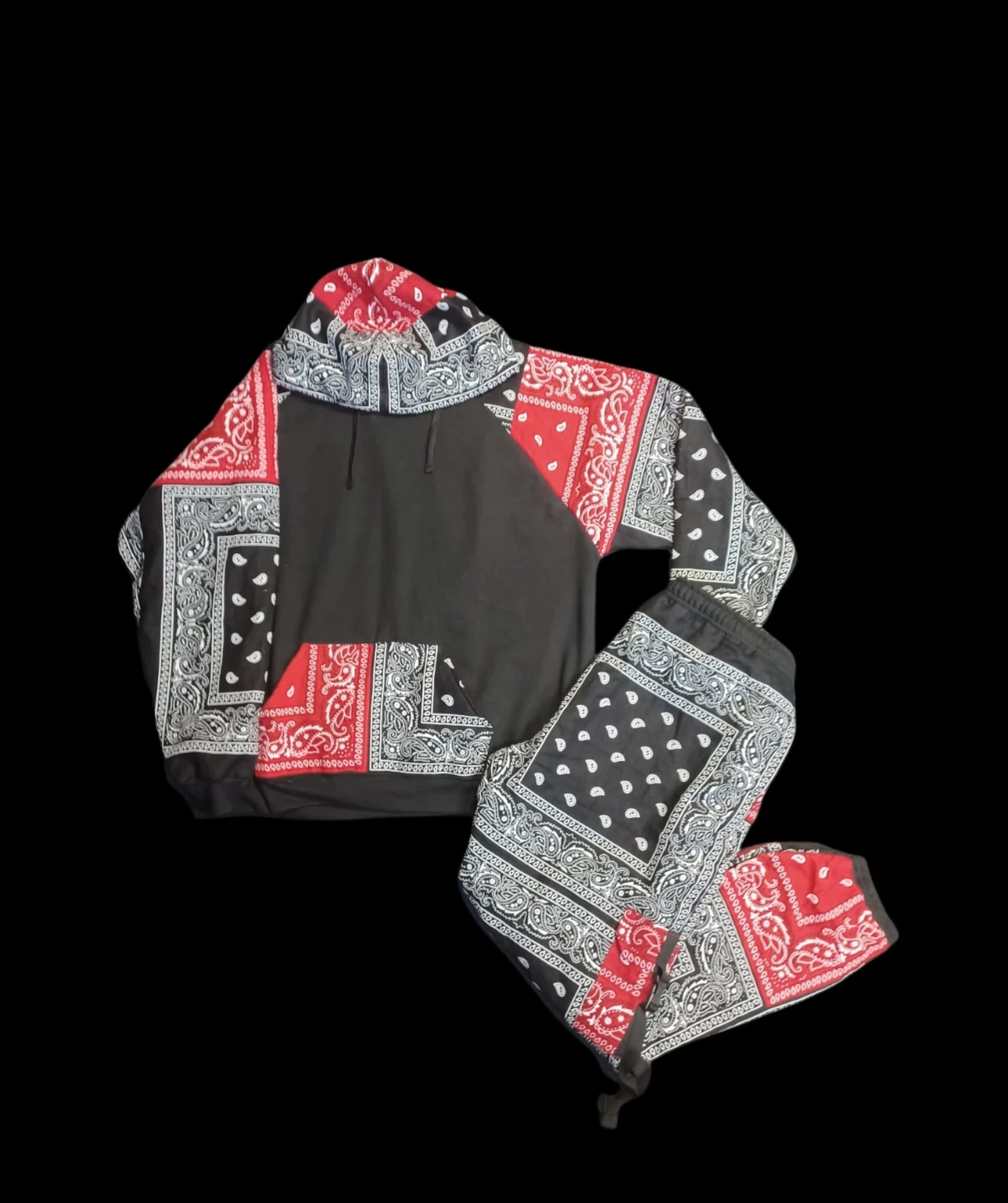 Selling a stylish hoodie and pants set with a cool bandana print design. The set features a black base colour accented with red and white bandana patterns. Perfect for a unique and trendy look!