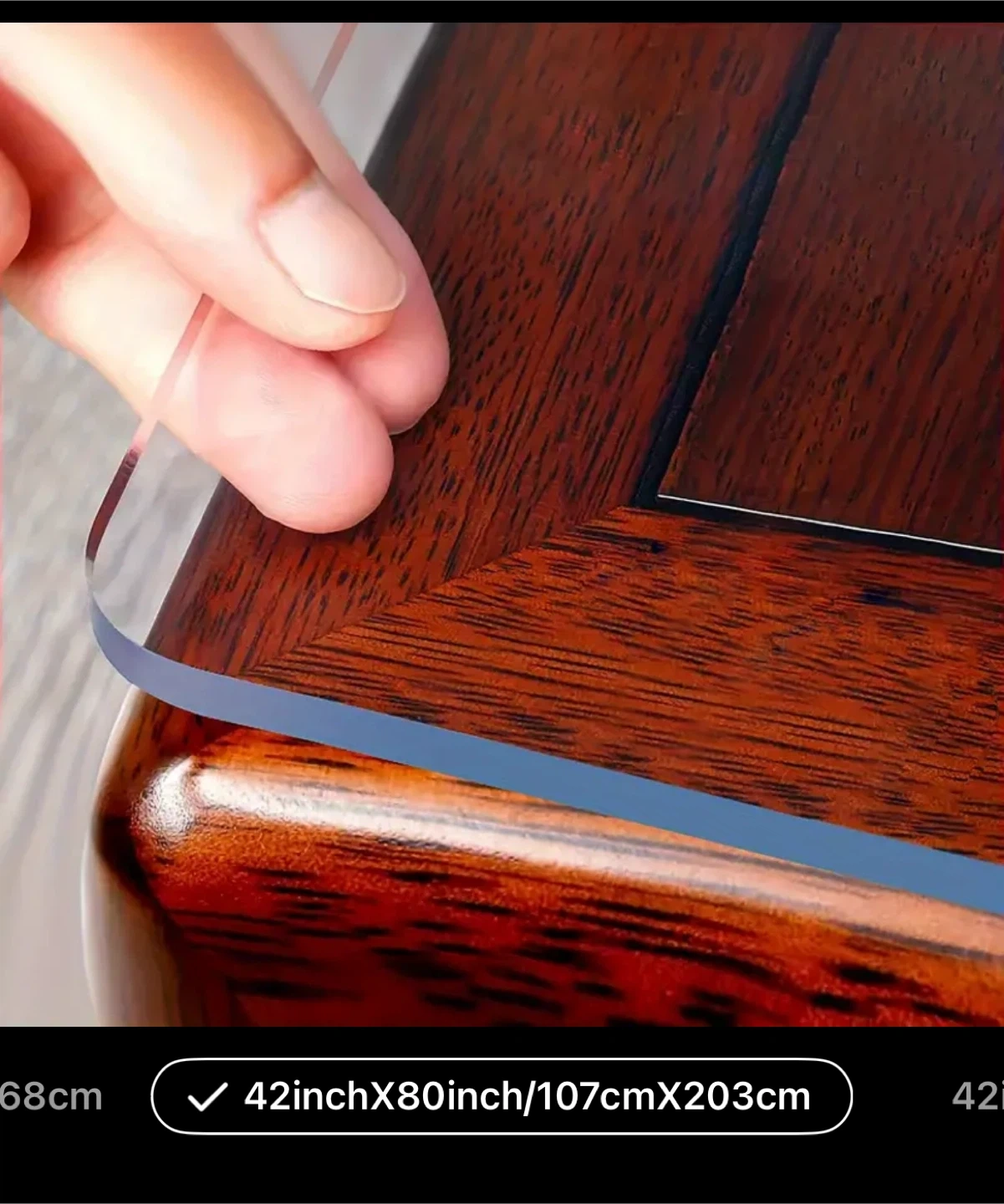 Selling a clear table protector cover! It measures 42 inches by 80 inches (107cm x 203cm). Protect your table from scratches and spills with this handy cover