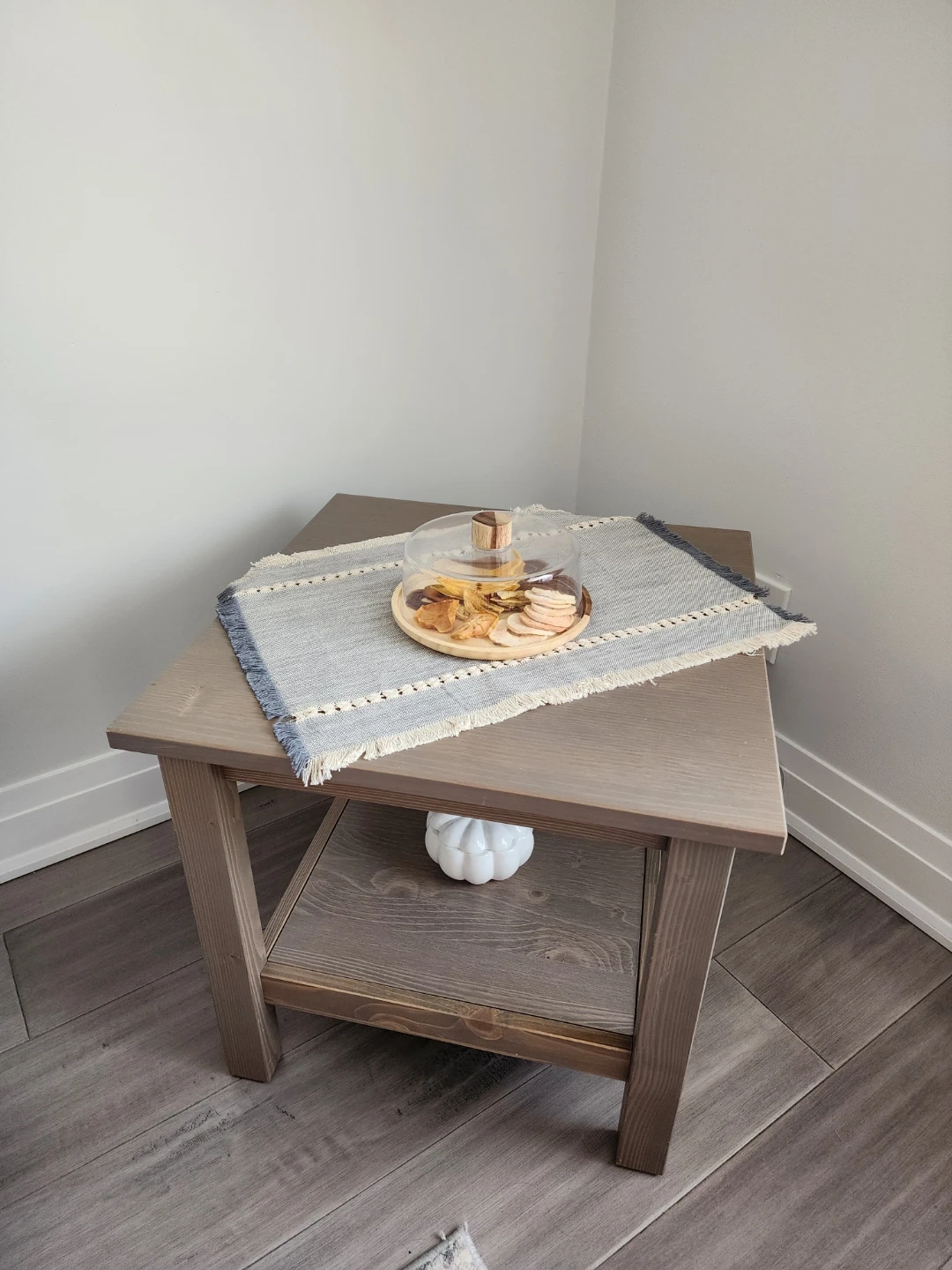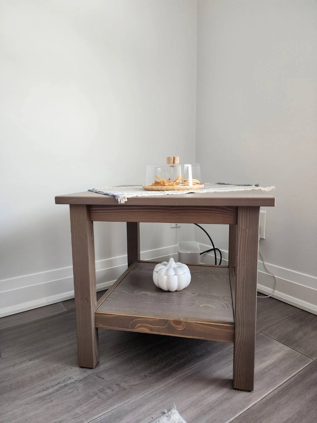 Selling two twin lovely side tables that are in great condition! It features a handy shelf underneath for extra storage or decor. The neutral colour would fit in with any room!