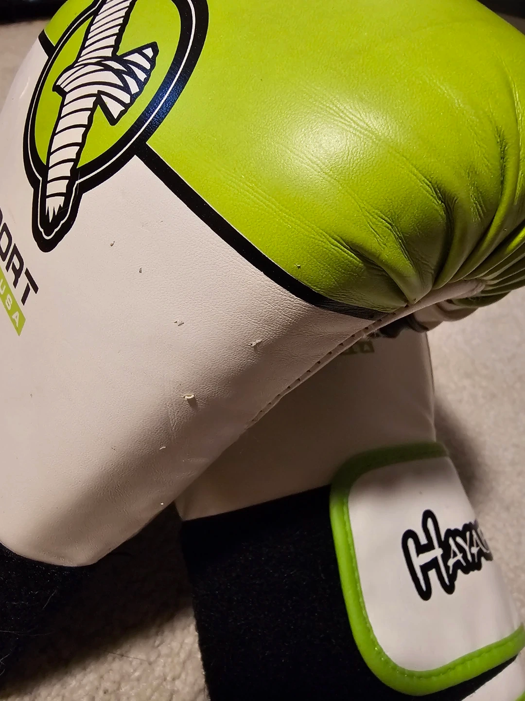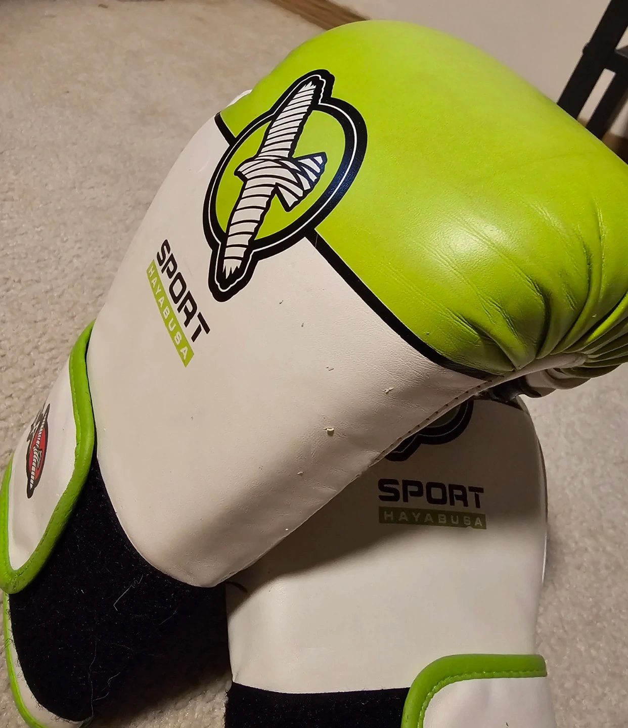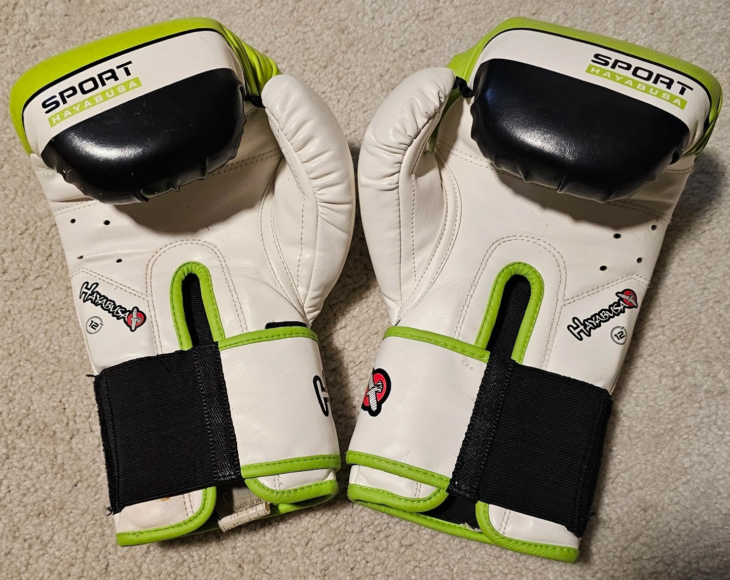 Selling a pair of Hayabusa Sport boxing gloves designed for teen/adult unisex use. They're white with green accents and in great condition. Great for sparring or bag work!