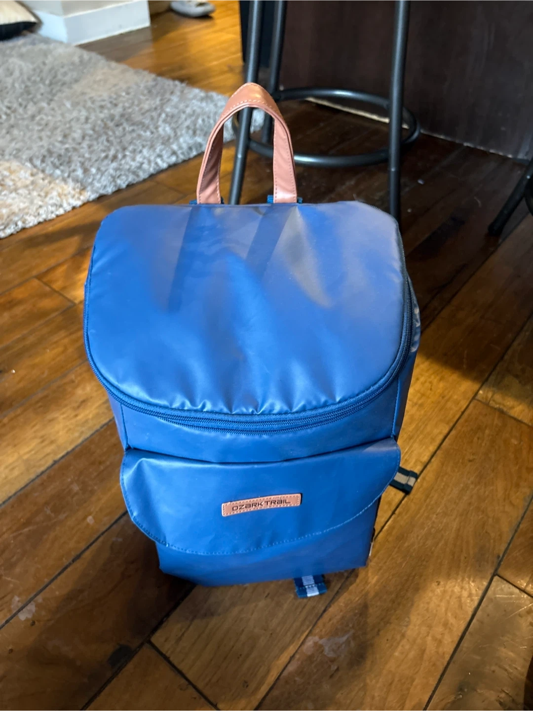 Check out this Ozark Trail cooler backpack! It's in great shape and ready for your next picnic or outdoor adventure. The blue colour is really nice, and it's super practical for keeping your drinks and snacks cool on the go