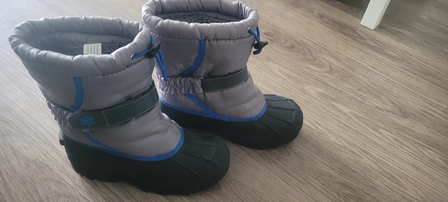 These kids' winter boots are in great shape and ready for some snowy adventures! They're size 3 and feature a sturdy black sole with a grey upper, accented with blue trim. Perfect for keeping little feet warm and dry this winter season